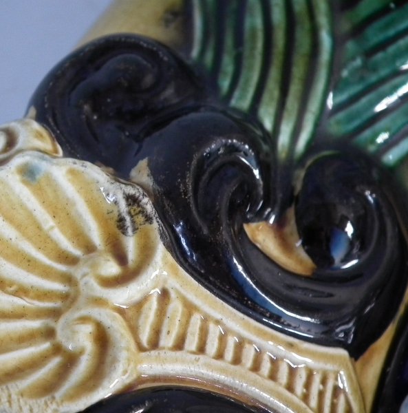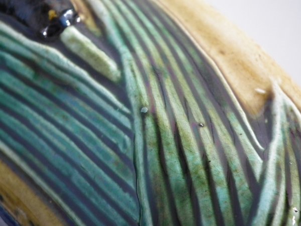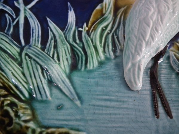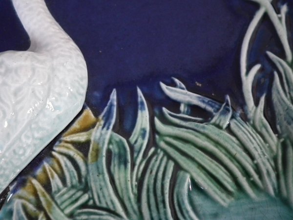 Victorian, circa 1880. 13.4ins high, 11.4ins wide, 1.6ins depth. Majolica wall plaque which features a stork standing in a pond. Colouration: cobalt blue, yellow, green, are predominant.