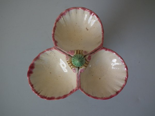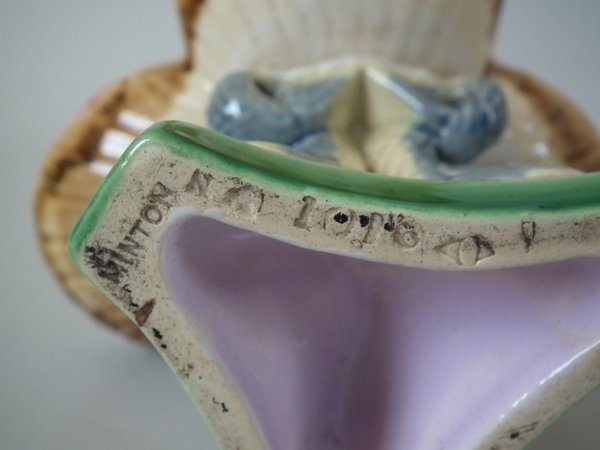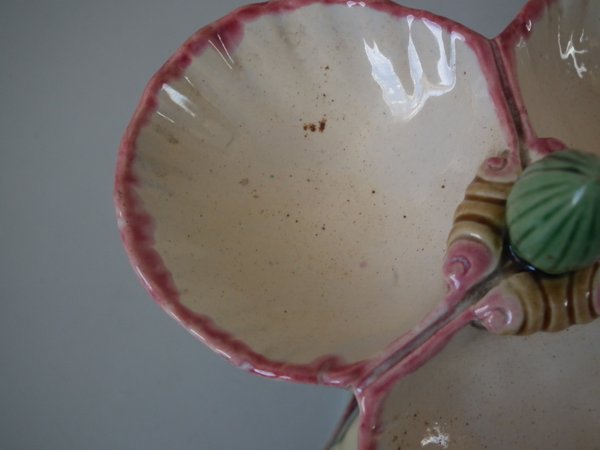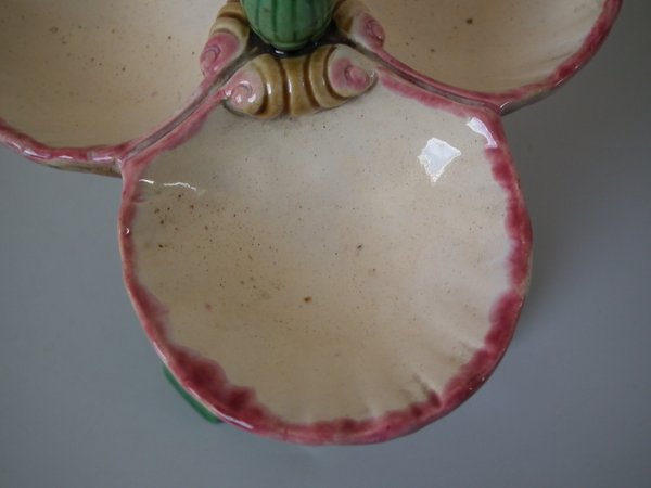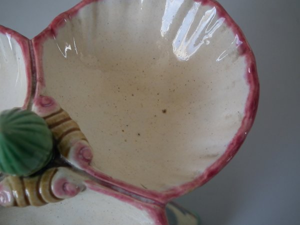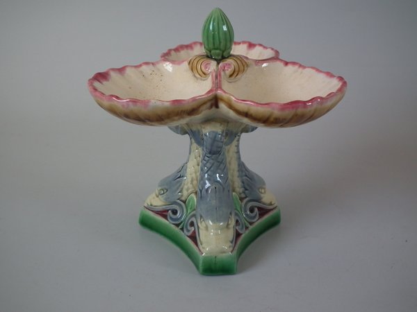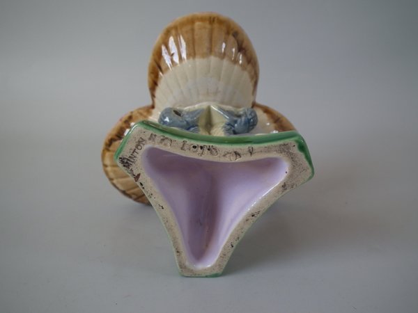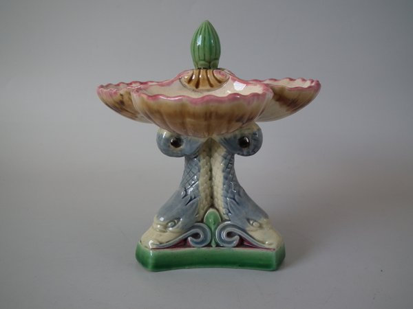 Victorian, circa 1863. 4.5ins high, 4.3ins wide, 4.3ins depth. Minton Majolica salt which features three fish each supporting a shell with their tails. Colouration: cream, green, puce, are predominant.