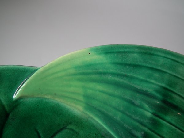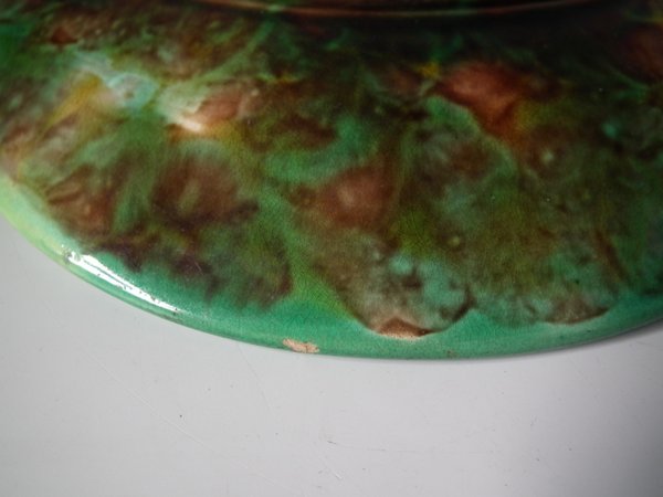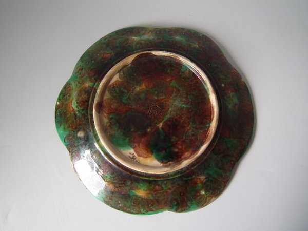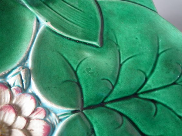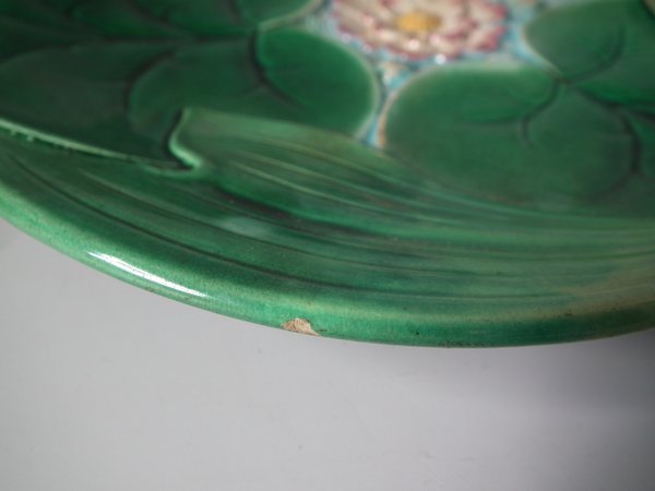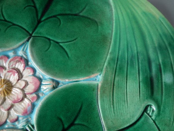 George Jones Majolica plate which features a pond lily flower surrounded by overlapping leaves.