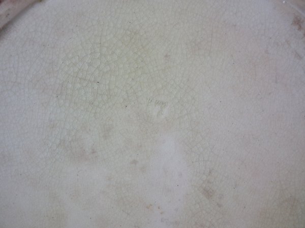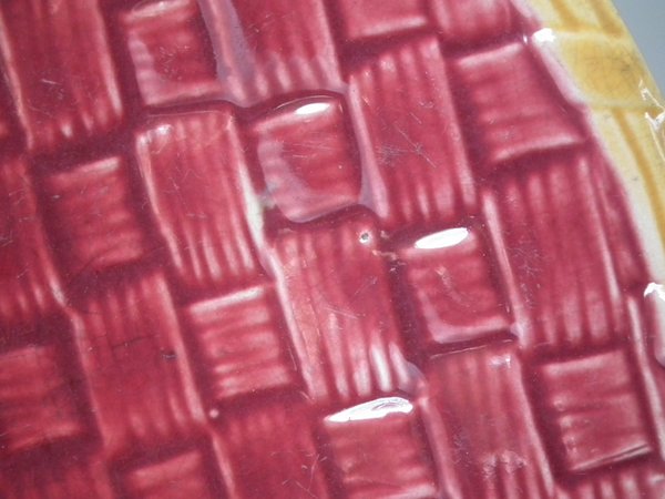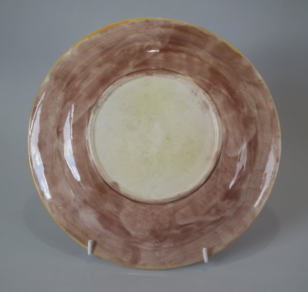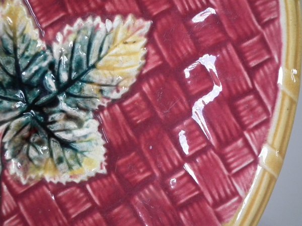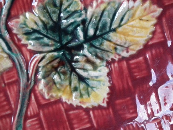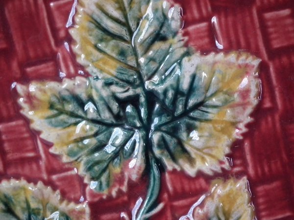 Majolica plate which features a sprig of leaves on a basket weave ground.