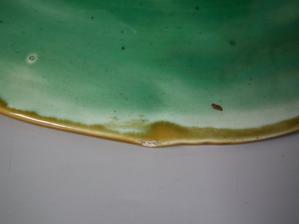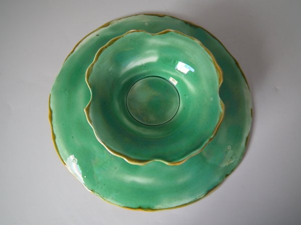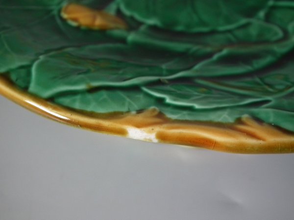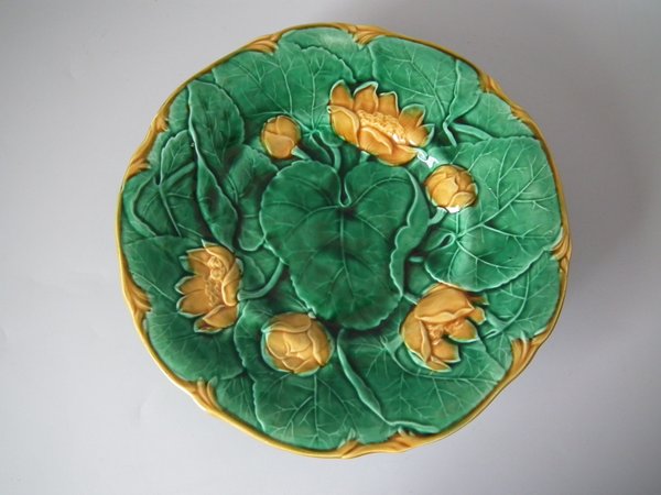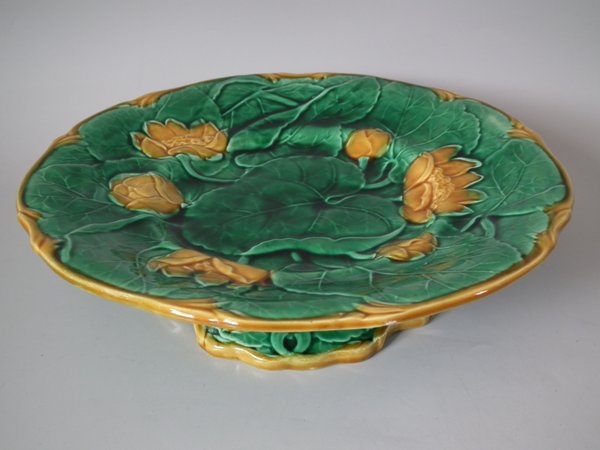 Victorian, circa 1870. 2.2ins high, 9.1ins wide, 9.1ins depth. Unidentified English Majolica compote which features lily flowers and leaves.