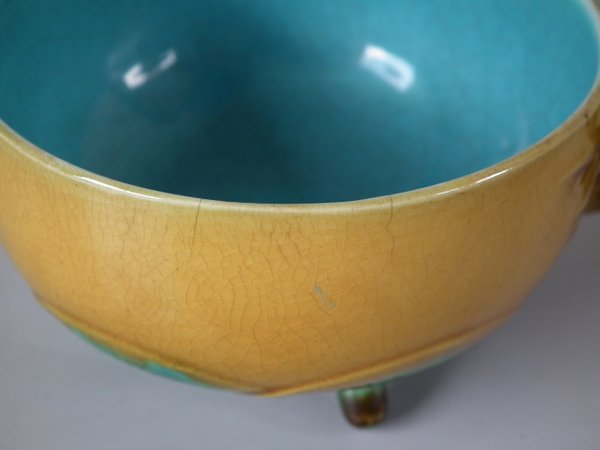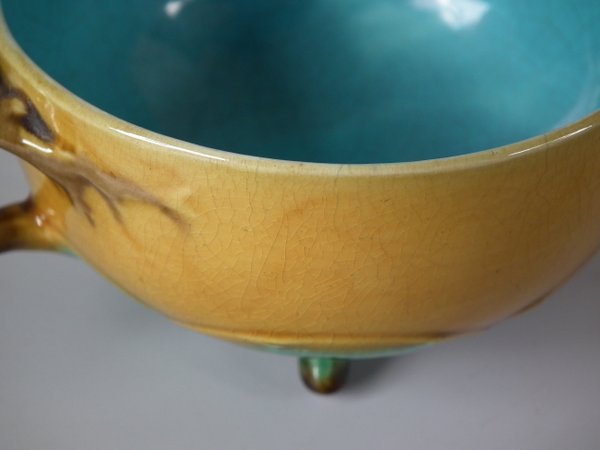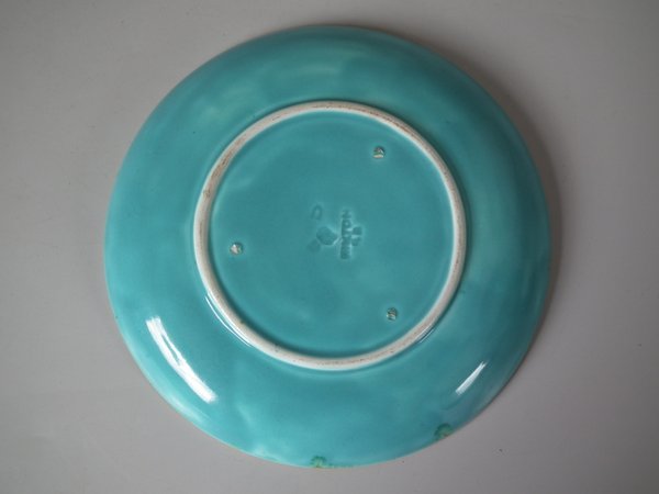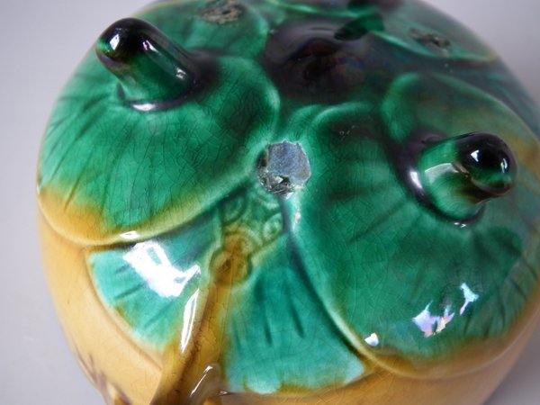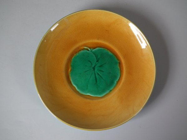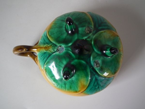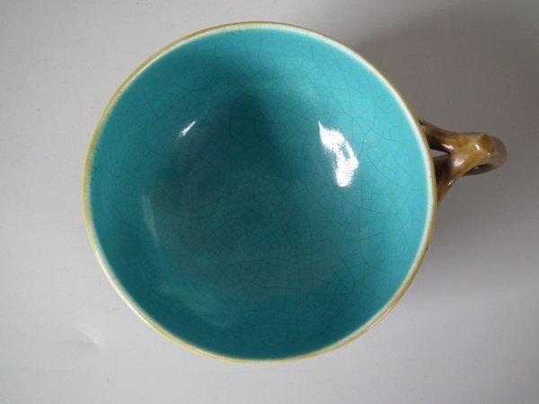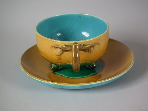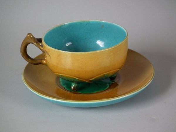 Victorian, circa 1872. 2.4ins high, 5.5ins wide, 5.5ins depth. Minton Majolica cup & saucer which features lily pads.