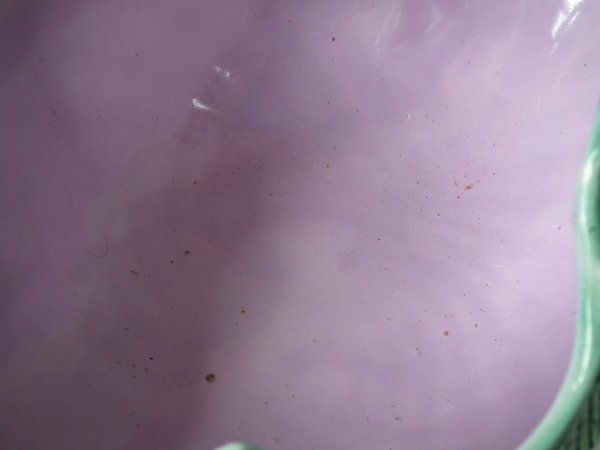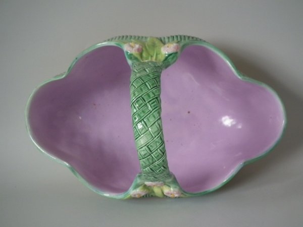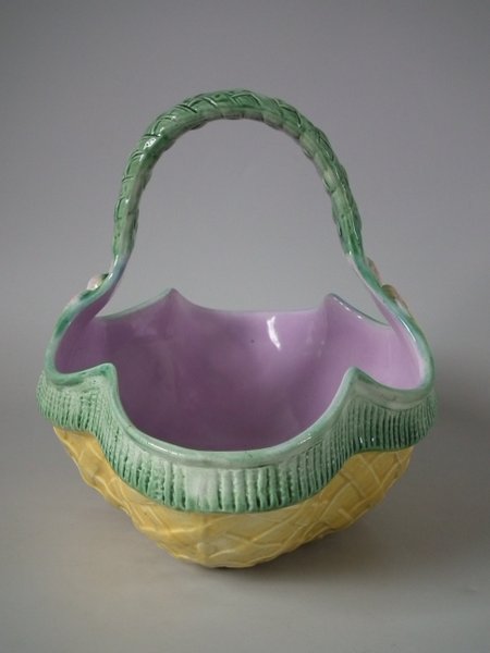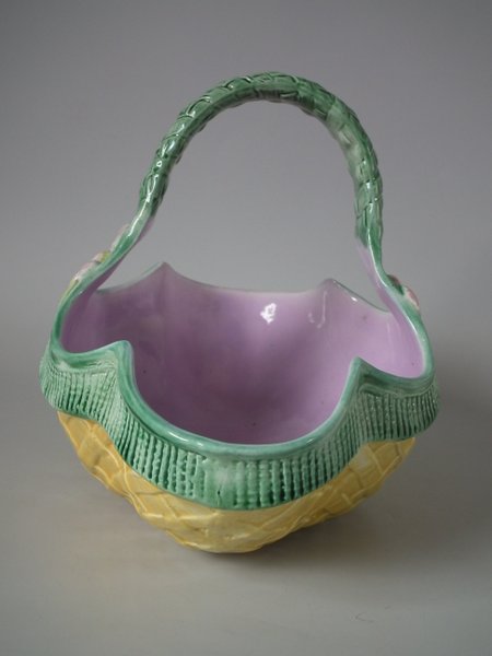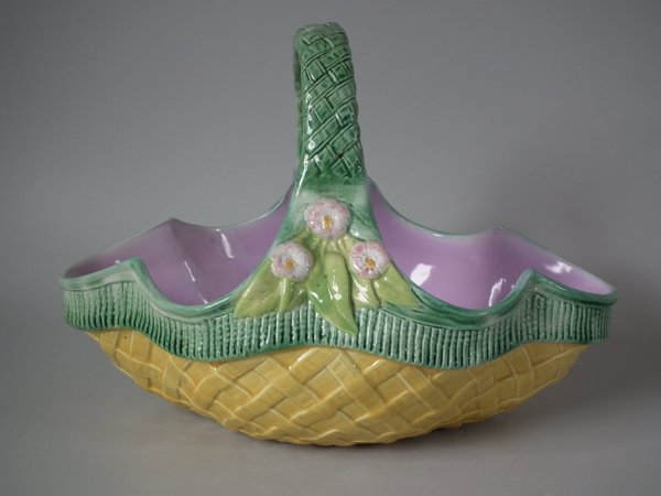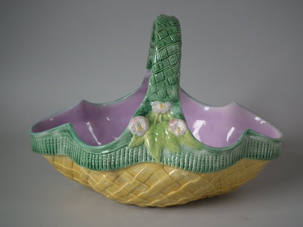 Victorian, circa 1875. 7.5ins high, 10.2ins wide, 5.9ins depth. Unidentified English Majolica basket (possibly Brown Westhead Moore & Co)