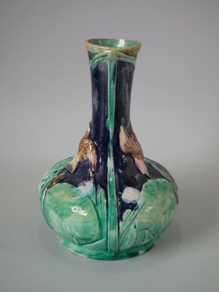 Majolica vase which features birds diving in and flying out of water lilies and bulrushes.