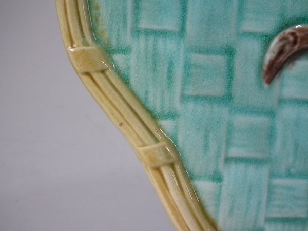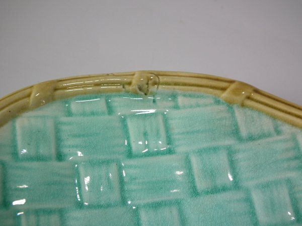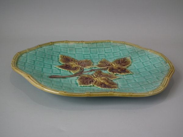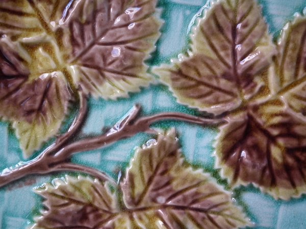 Majolica platter which features a sprig of leaves on a basket weave ground.