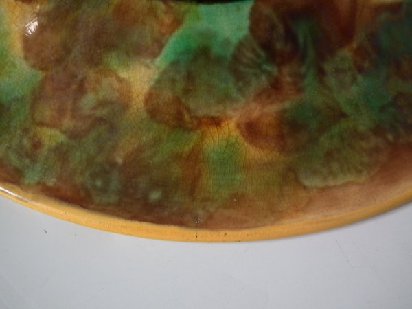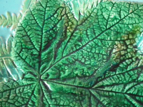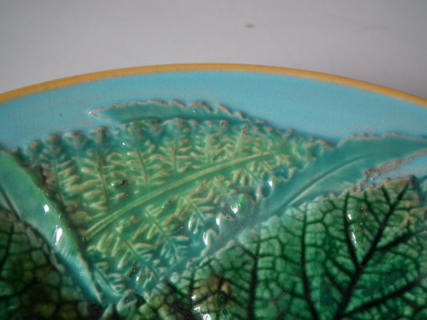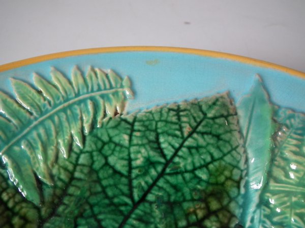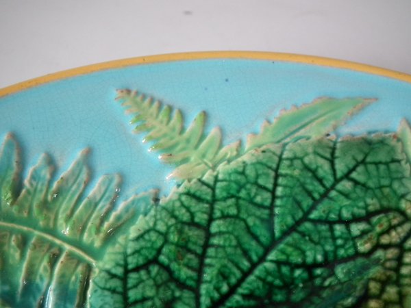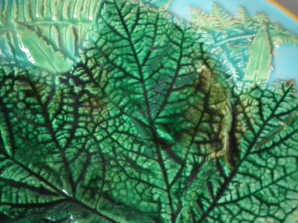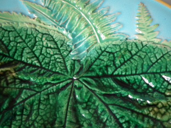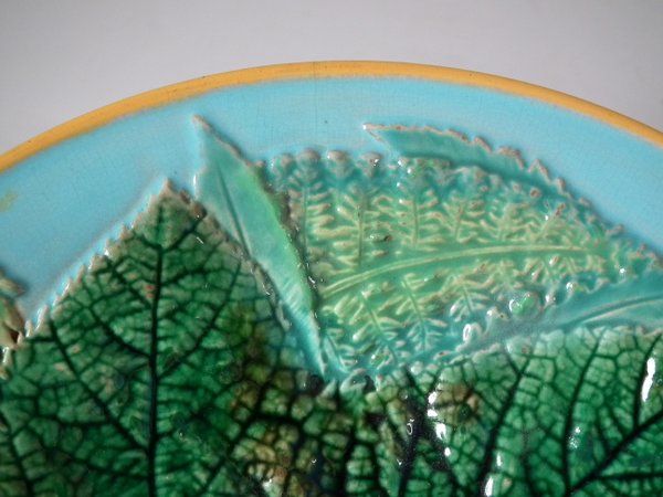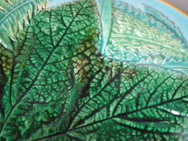 Victorian, circa 1870. 8.4ins high, 8.4ins wide, 1.1ins depth. George Jones Majolica plate which features a maple leaf and fern fronds.