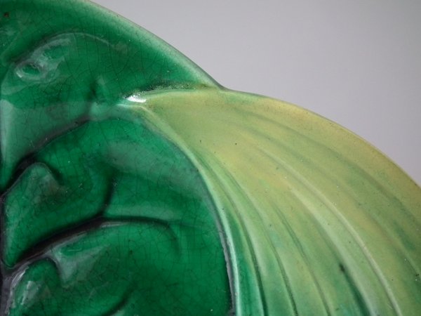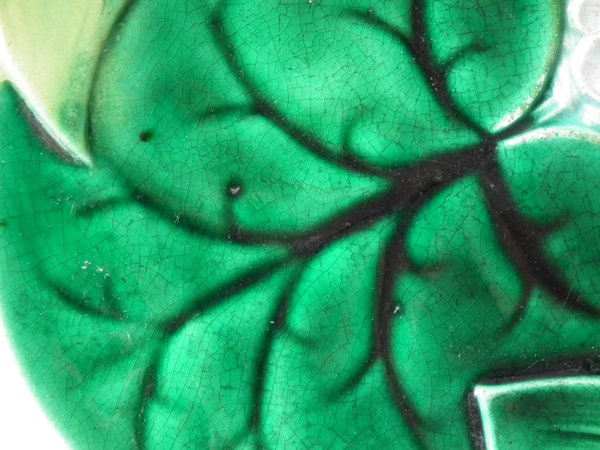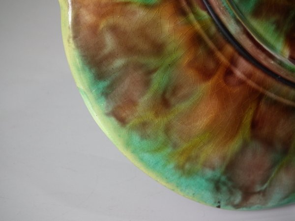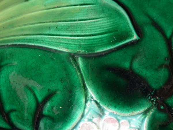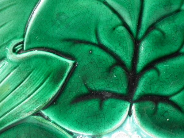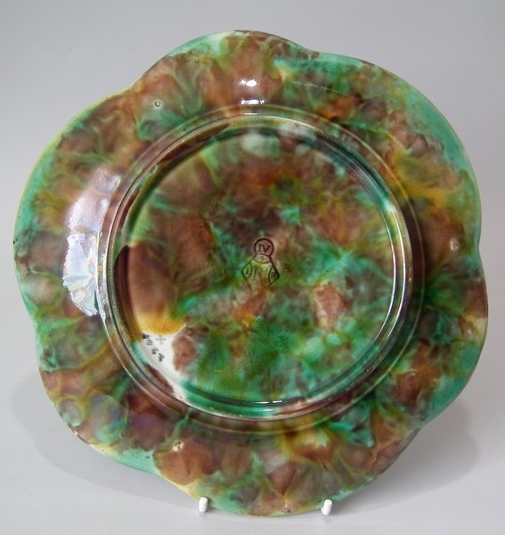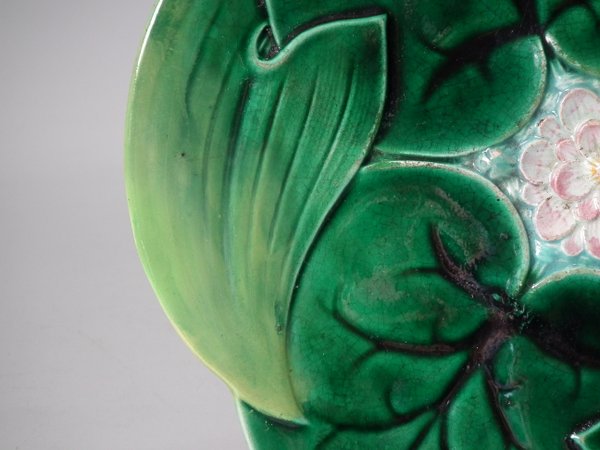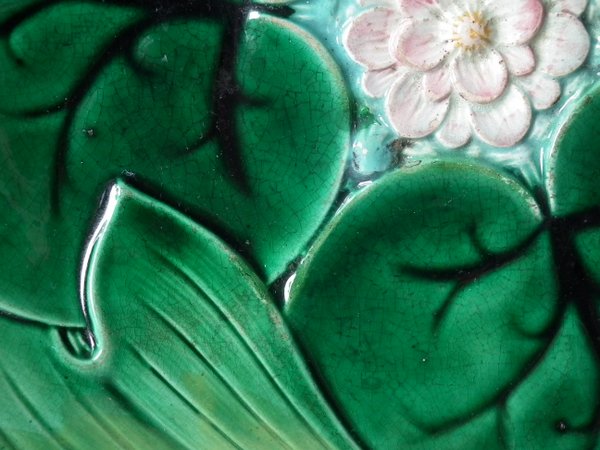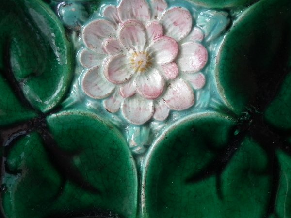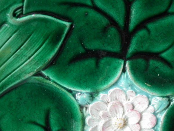 George Jones Majolica plate which features a pond lily flower surrounded by overlapping leaves.