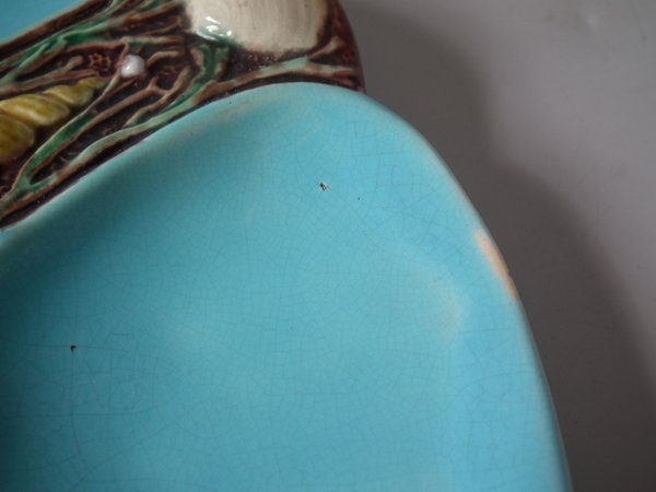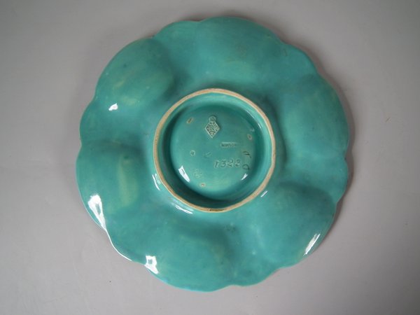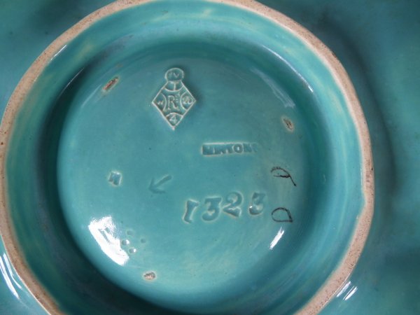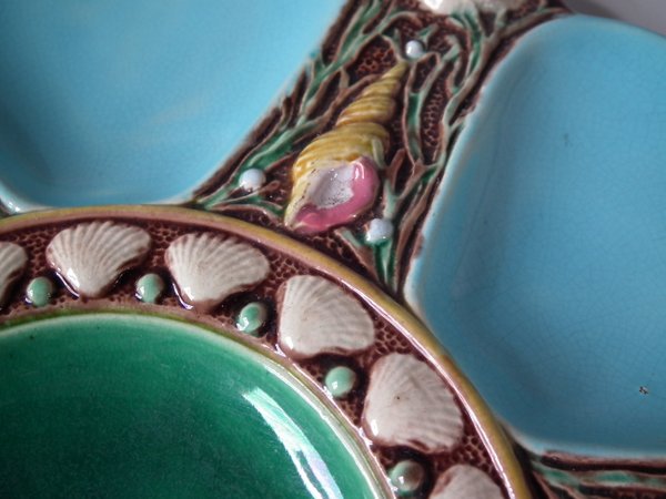 Victorian, circa 1874. 9.1ins high, 9.1ins wide, 0.6ins depth. Minton Majolica oyster plate which features six shell shaped wells with seashell surrounds.