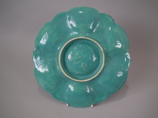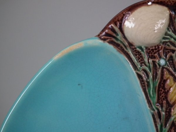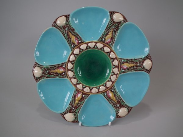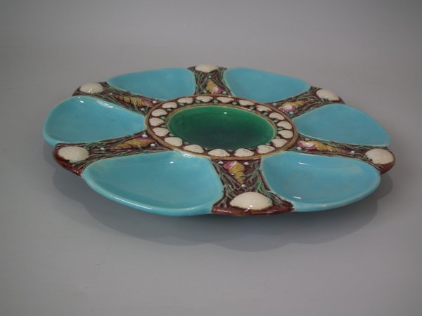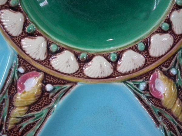 Minton Majolica oyster plate which features six shell shaped wells with seashell surrounds.