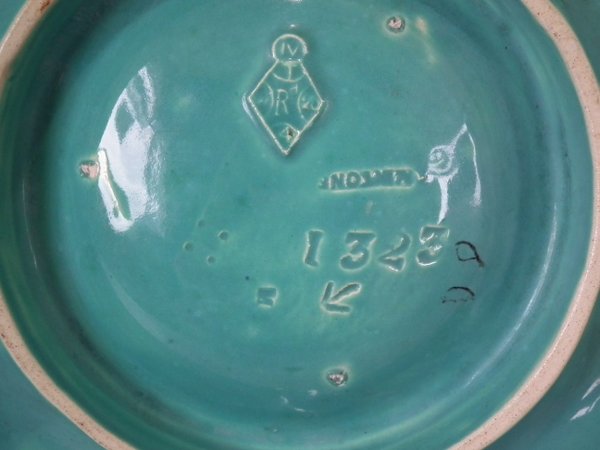 The piece bears maker's marks for the Minton pottery. Bears a pattern number, '1323'. English diamond registration mark for the date 20/03/1867. Marks include a factory specific date cipher for the year 1874.
