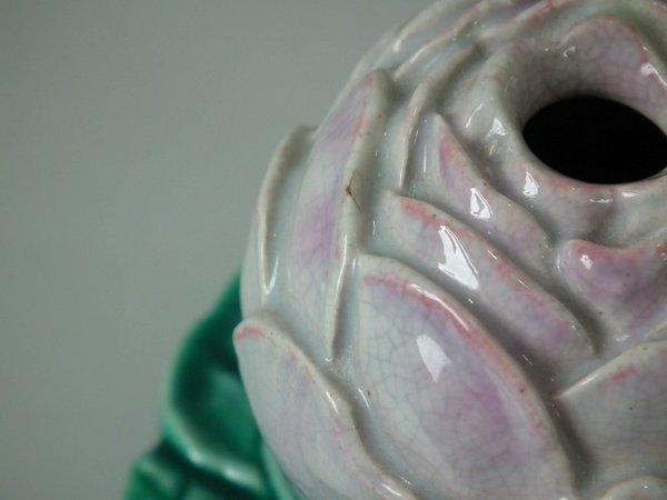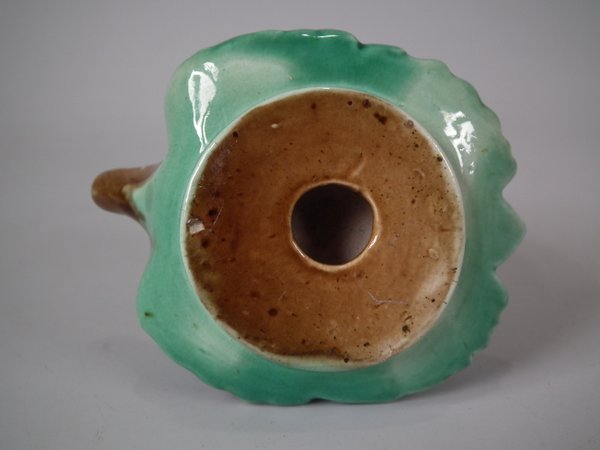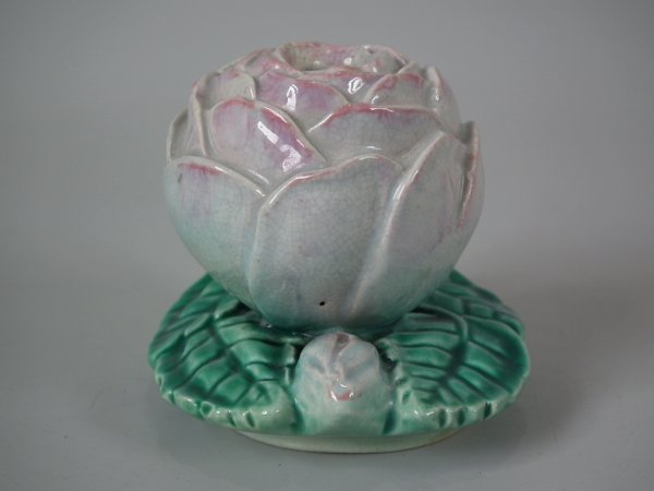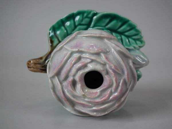 Majolica inkwell which features a single rose head resting two leaves and a rosebud.
