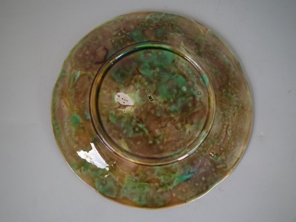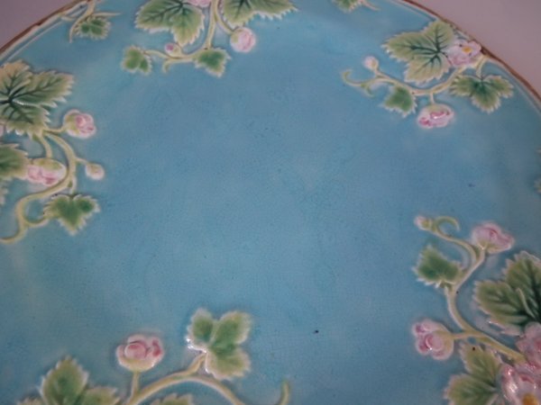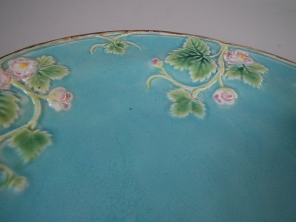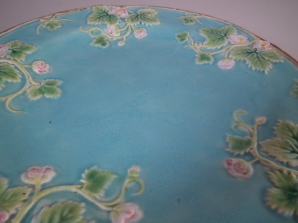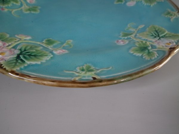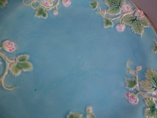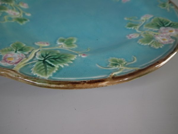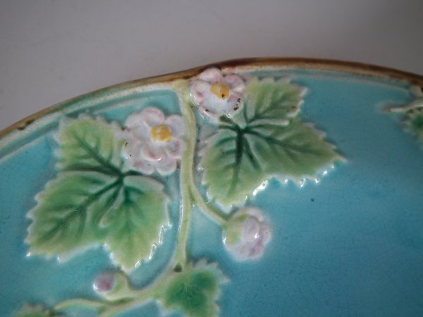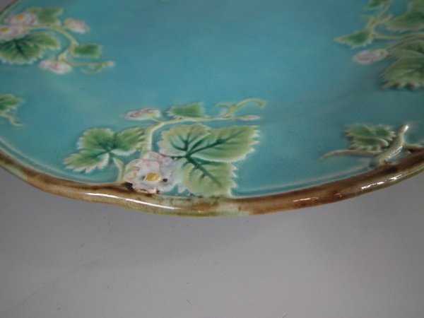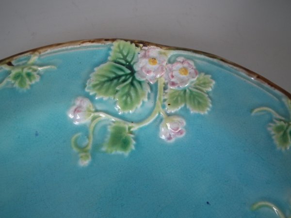 Victorian, circa 1870. 8.2ins high, 8.2ins wide, 0.8ins depth. George Jones Majolica plate which features strawberry leaves and blossoms.