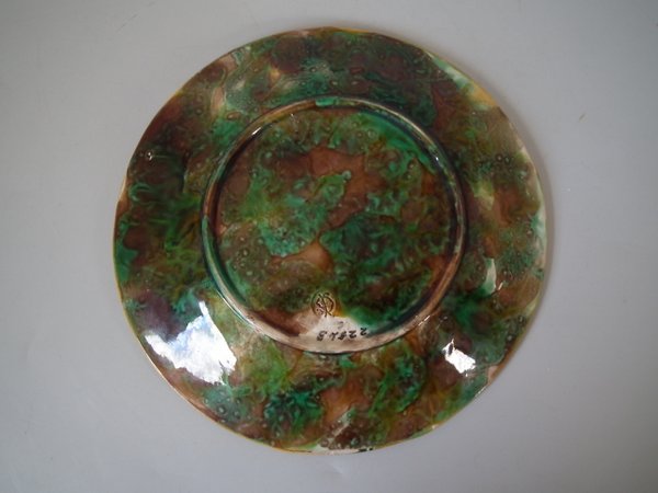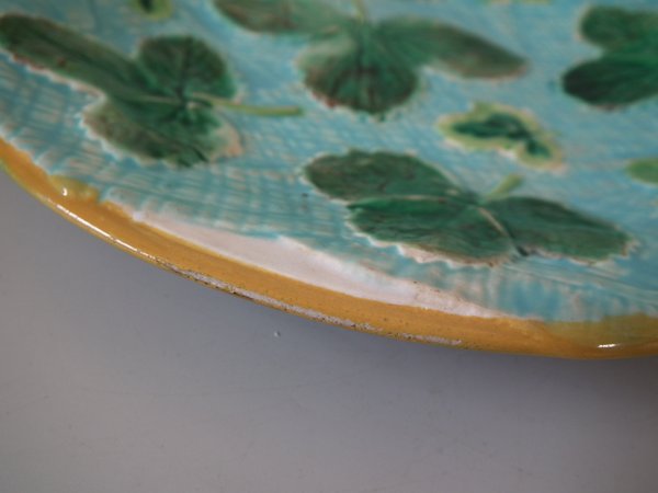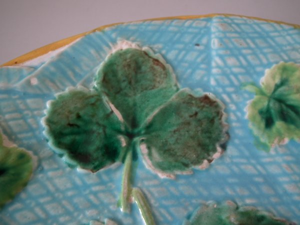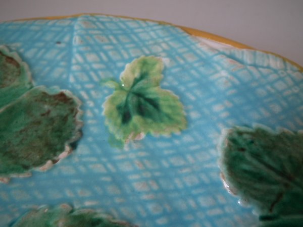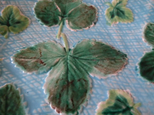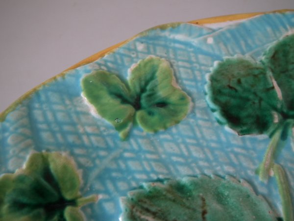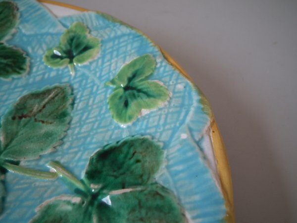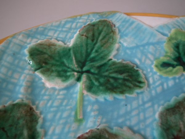 Victorian, circa 1870. 7.9ins high, 7.9ins wide, 0.9ins depth. George Jones Majolica plate which features strawberry leaves laid on a napkin.