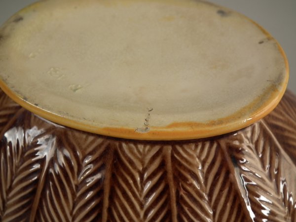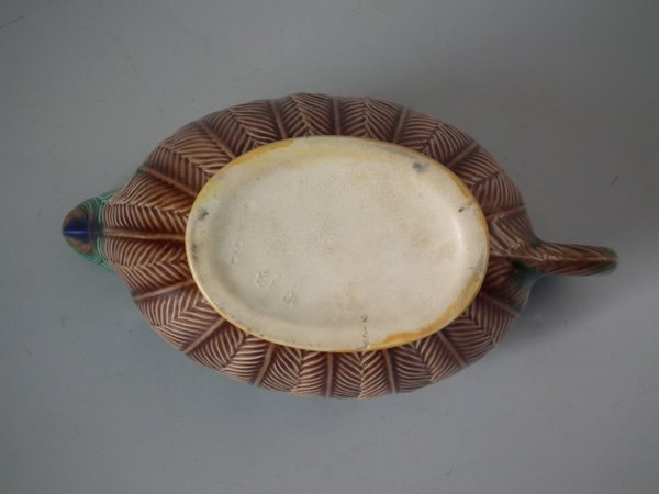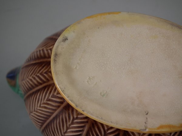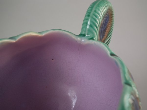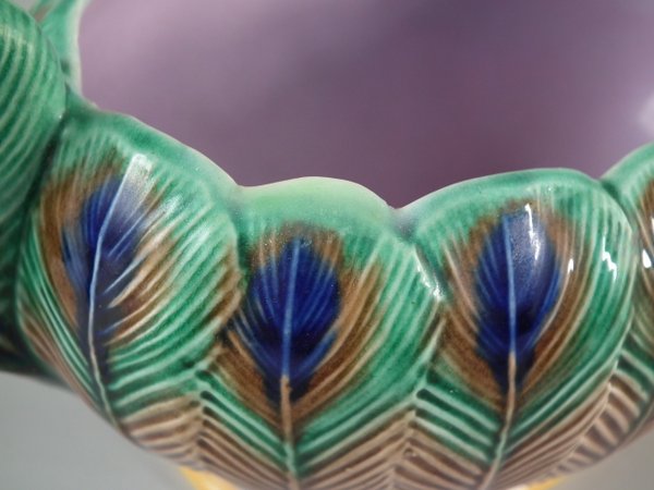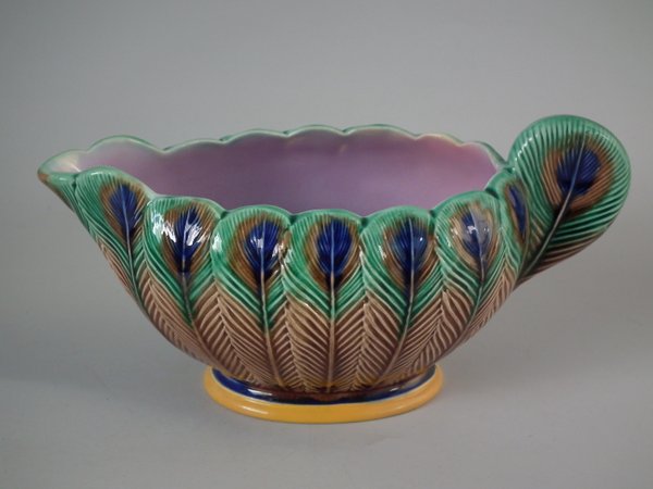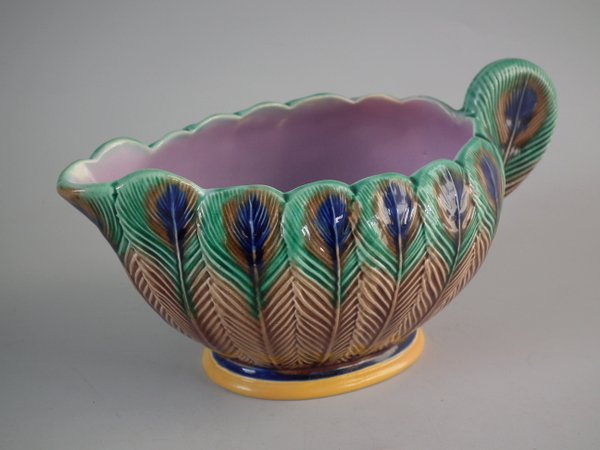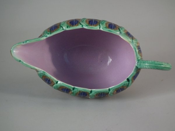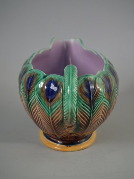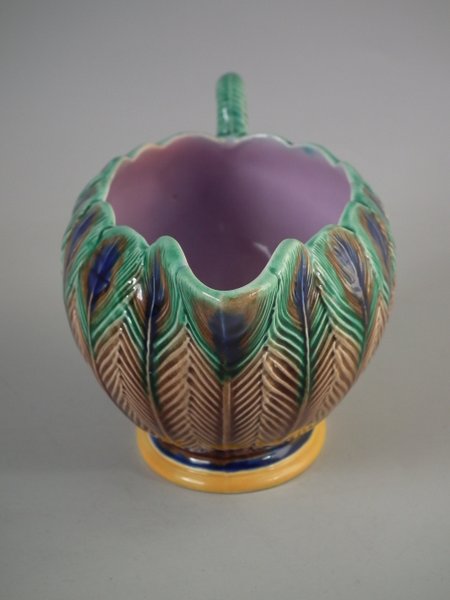 Victorian, circa 1875. 3.3ins high, 6.7ins wide, 3.5ins depth. Wedgwood Majolica creamer which features peacock feathers.