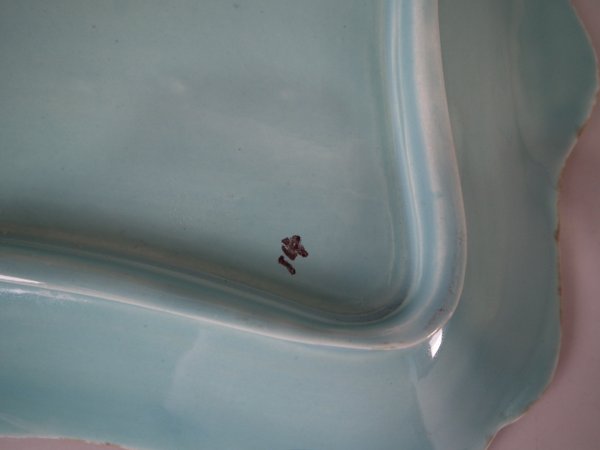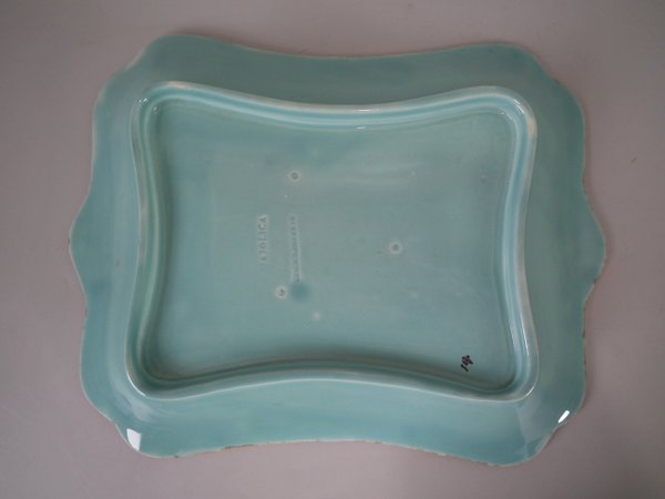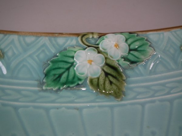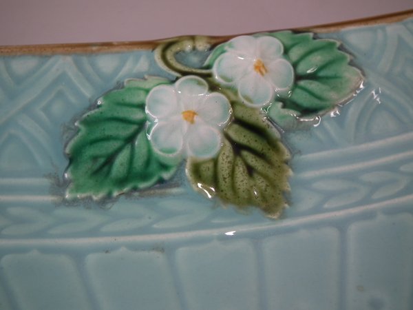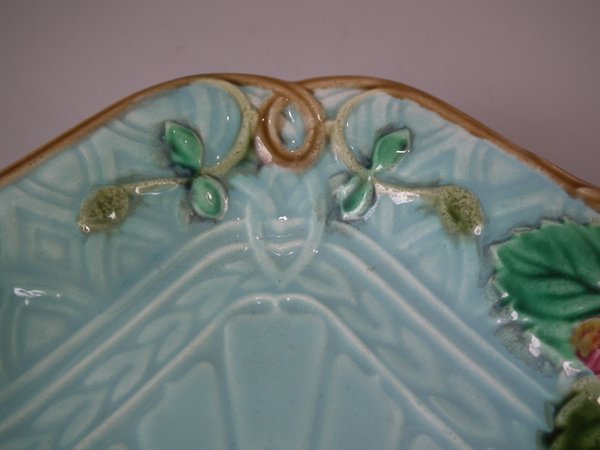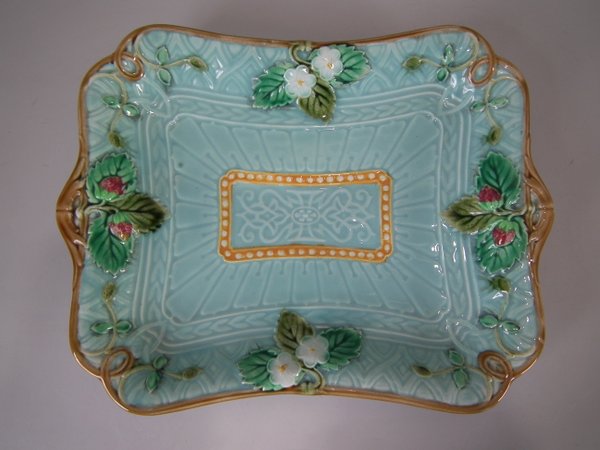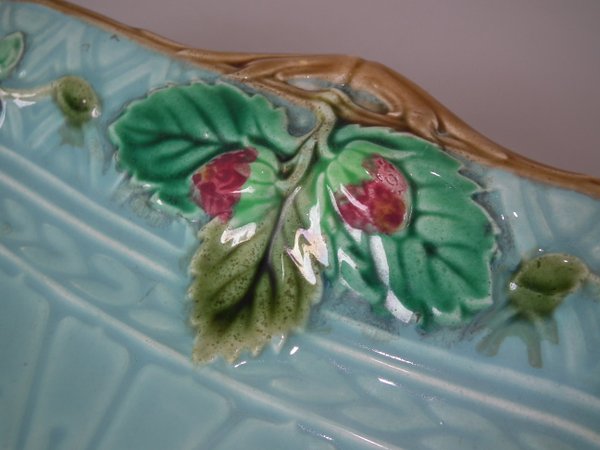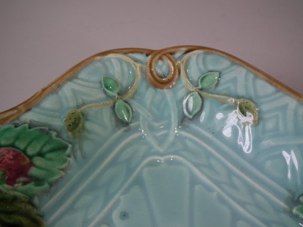 Victorian, circa 1880. 9.8ins high, 12.4ins wide, 1.8ins depth. Sarreguemines Majolica platter which features strawberries, leaves and blossoms.