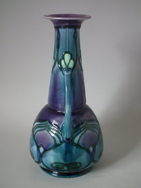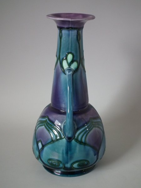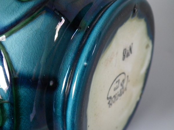 Decorated with stylized flower and leaf motifs, glazed in blues and purple. Green tube linings.
