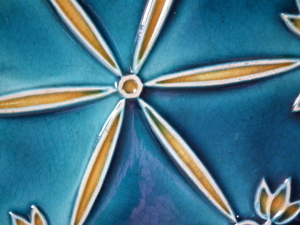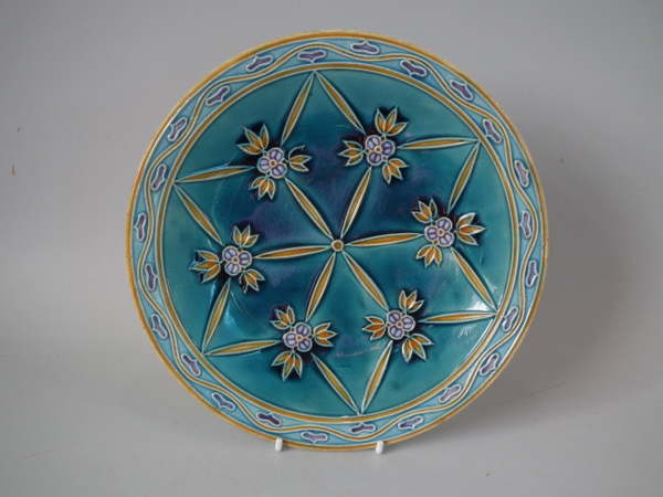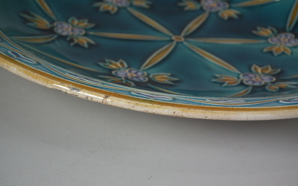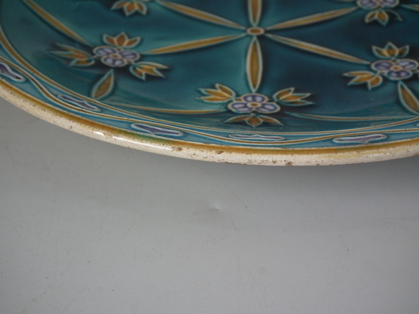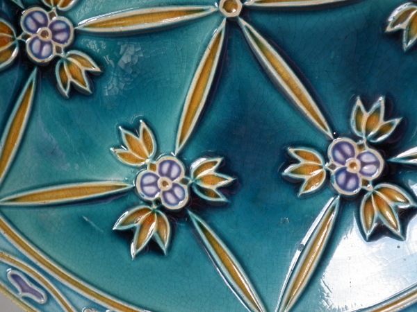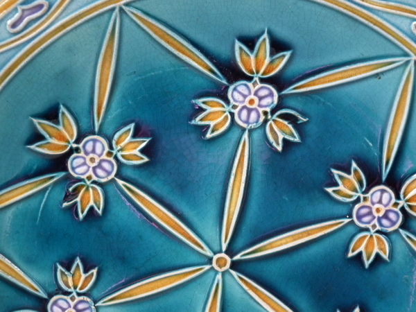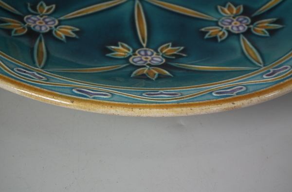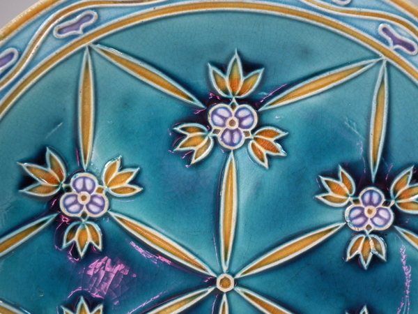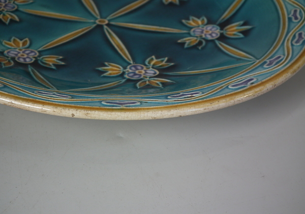 Mintons Secessionist jardiniere underplate decorated with stylised flowers and leaves on a blue ground.