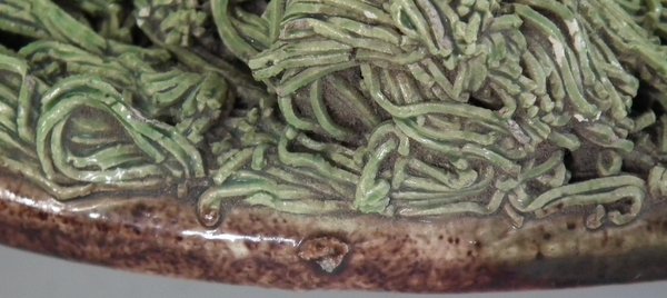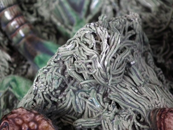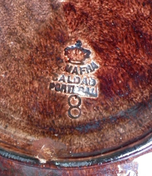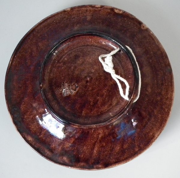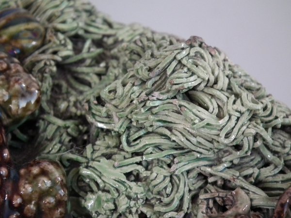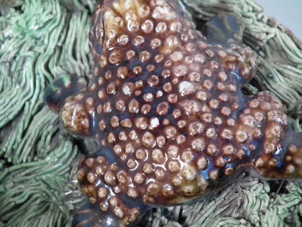 Victorian, circa 1890. 8.1ins high, 8.1ins wide, 2.4ins depth. Mafra Portuguese Palissy Majolica wall plate which features a lizard, toads and beetles. Colouration: green, brown, are predominant.