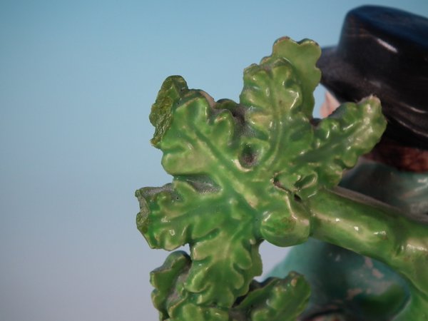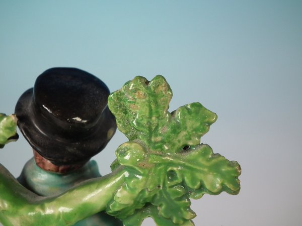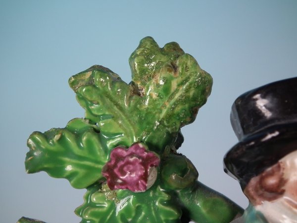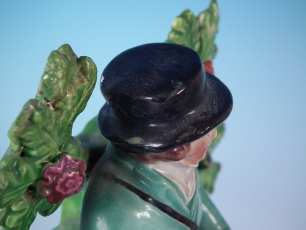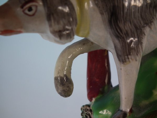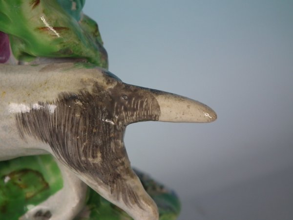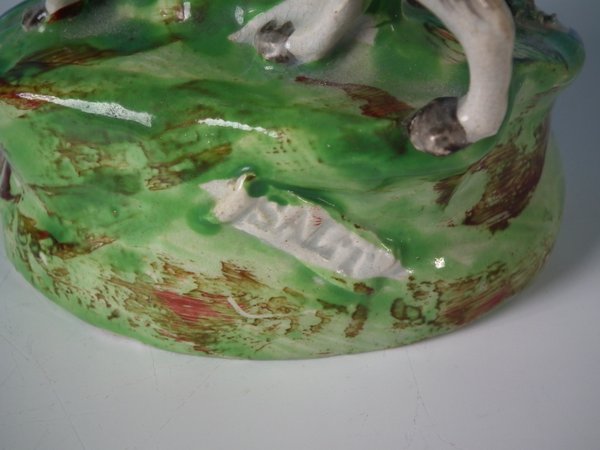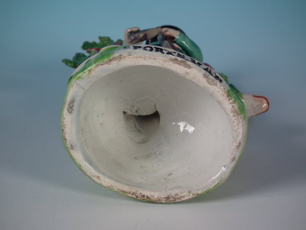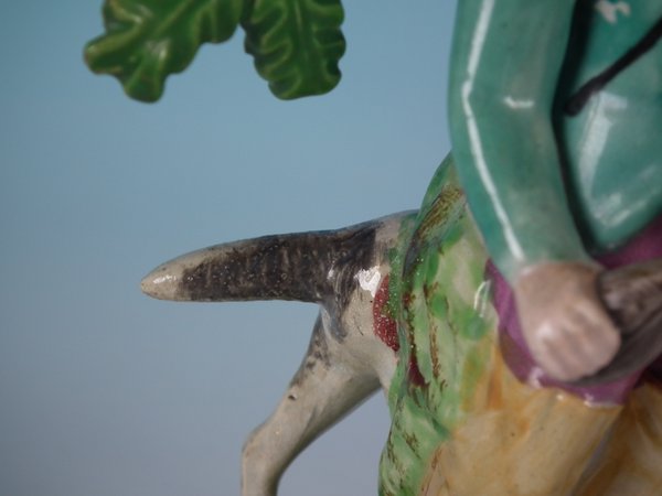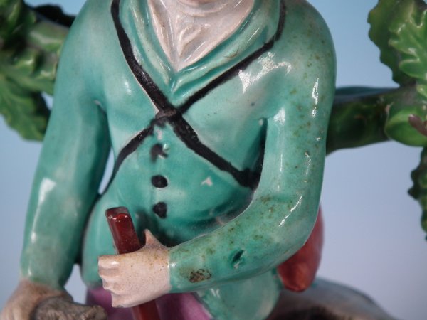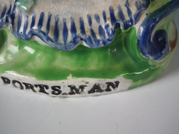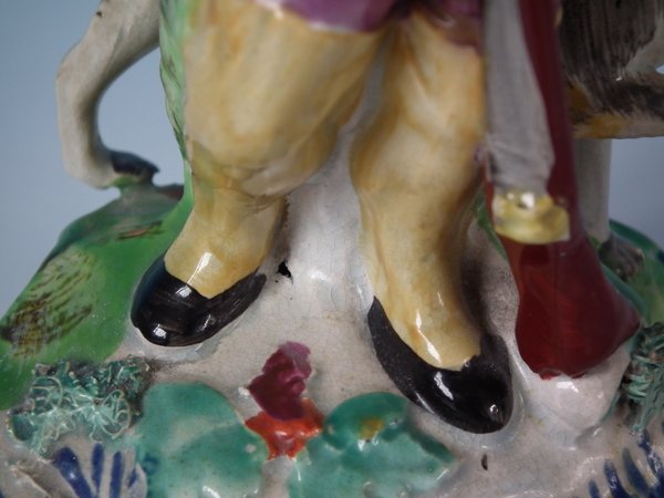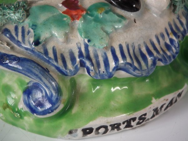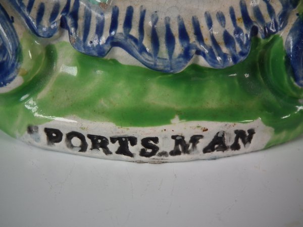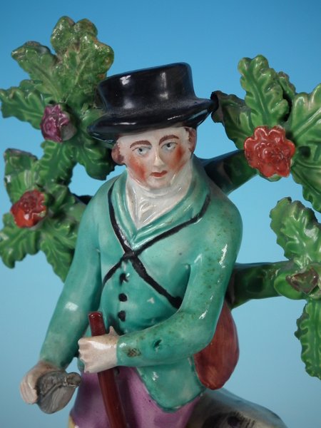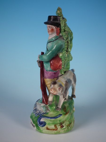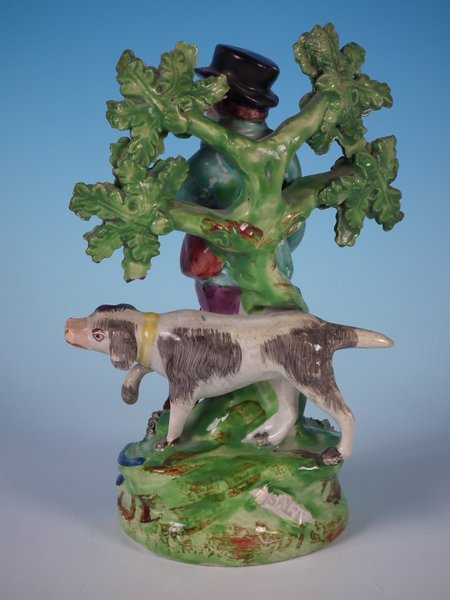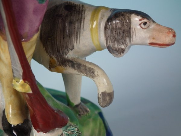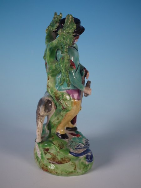pre-Victorian, circa 1820. 6.9ins high, 4.7ins wide, 2.8ins depth. Salt Staffordshire Pottery pearlware bocage figure with a sporting theme