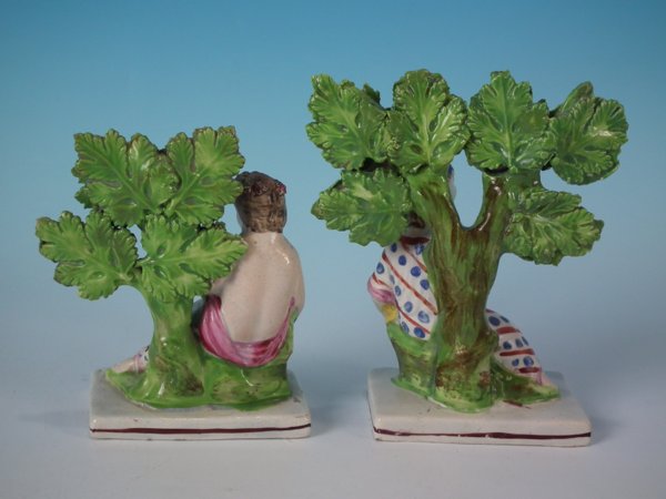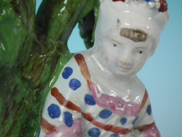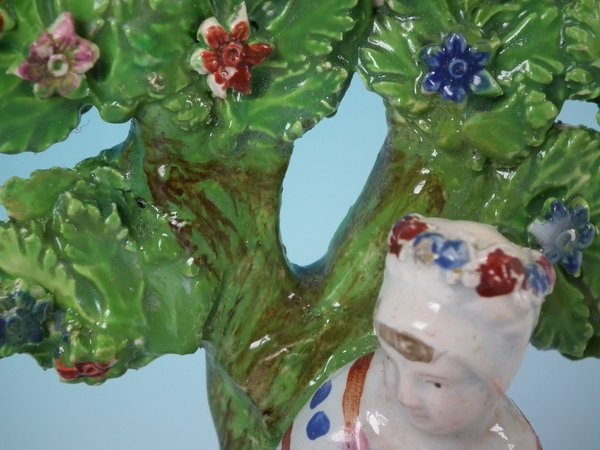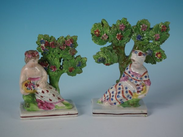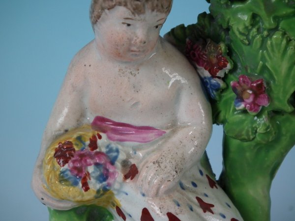 Pair of Staffordshire Pottery pearlware bocage figures with a childhood theme which feature a child in front of a bocage tree, holding a basket of flowers, seated on a rectangular base.