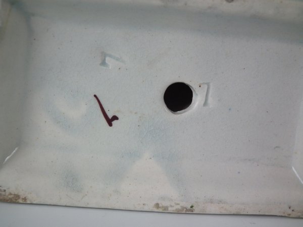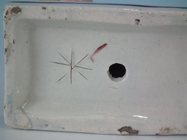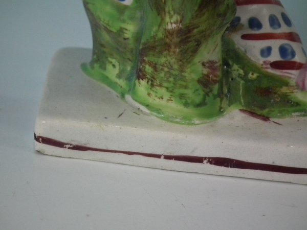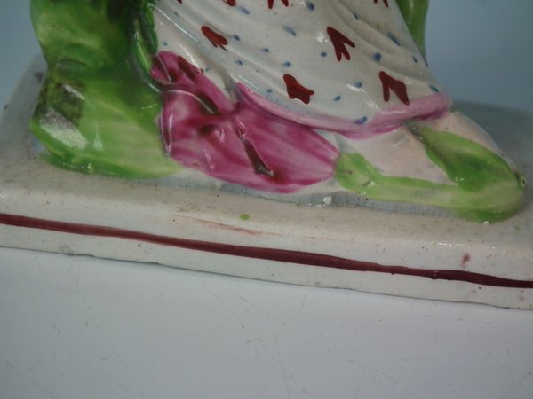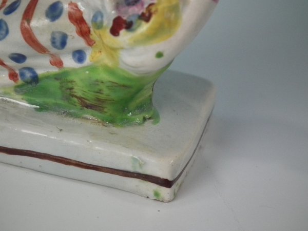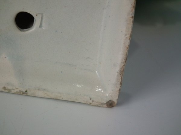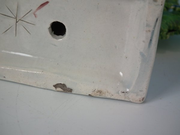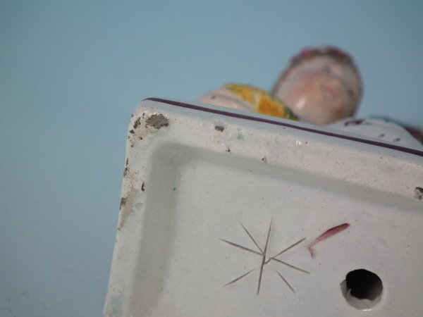KILN EFFECTS: flecks of stray coloured glaze to the base corner and left hand.