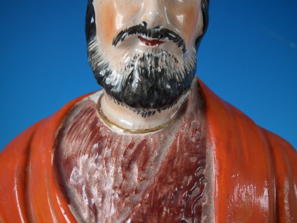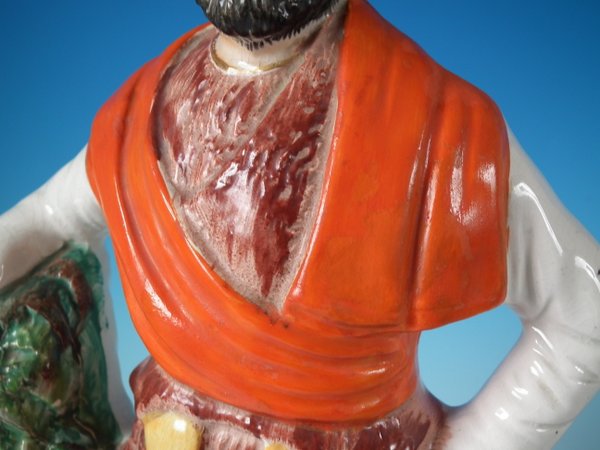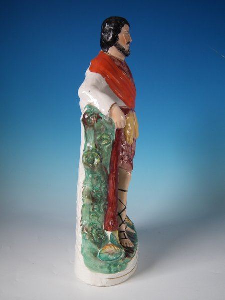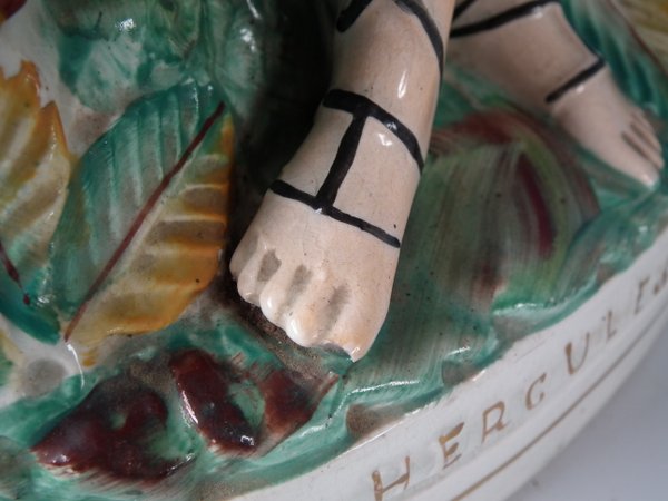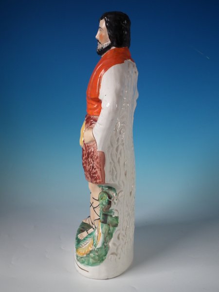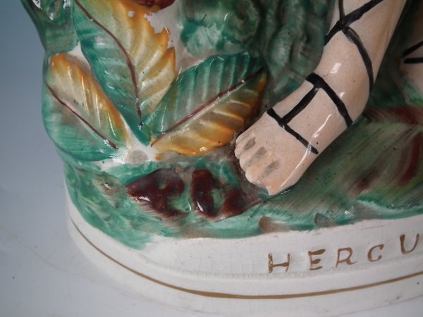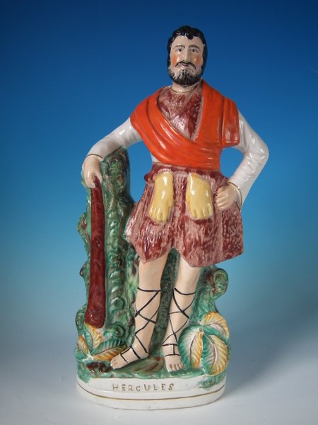 Victorian, circa 1860. 16.7ins high, 7.1ins wide, 16.5ins depth. Staffordshire Pottery figure with a mythological theme which features Hercules