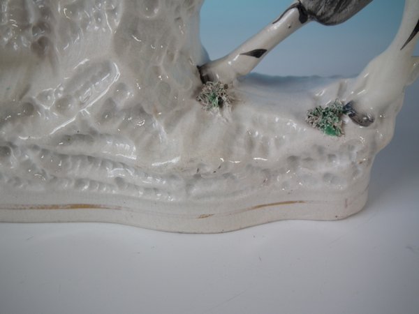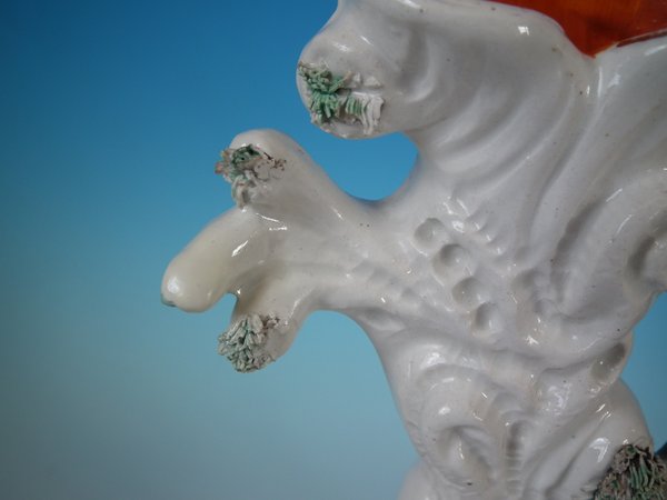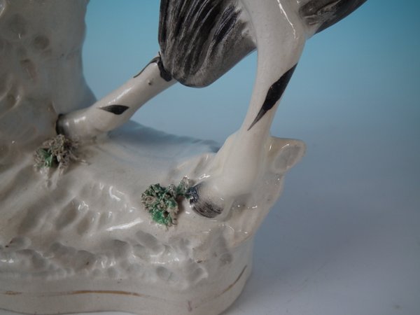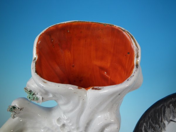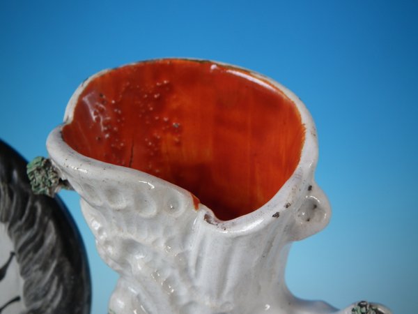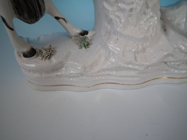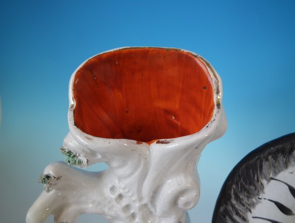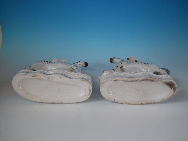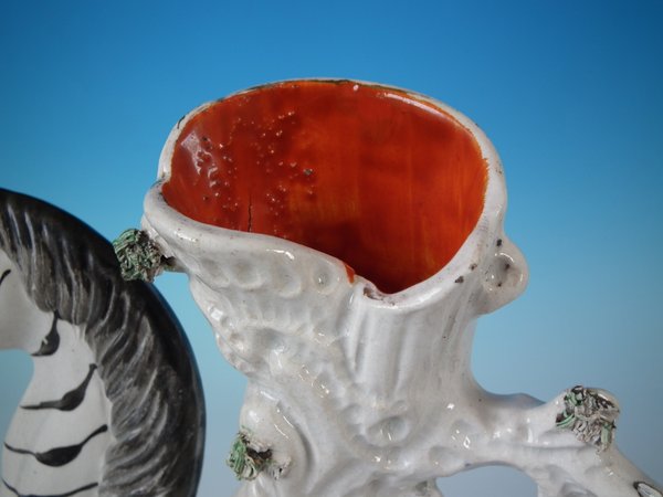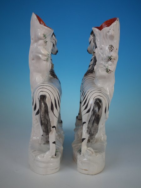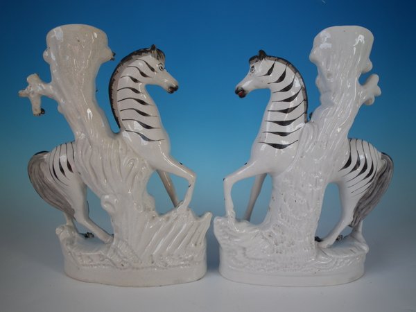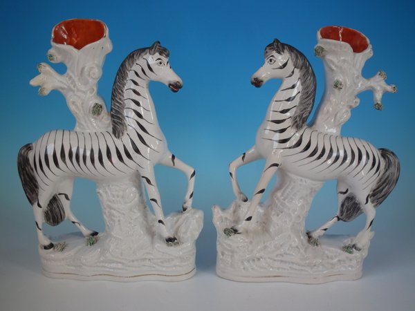 Victorian, circa 1870. Tallest is 11.4ins high, 8.7ins wide, 3ins depth. Pair of Staffordshire Pottery spill vases which feature a zebra, prancing on a shaped base.