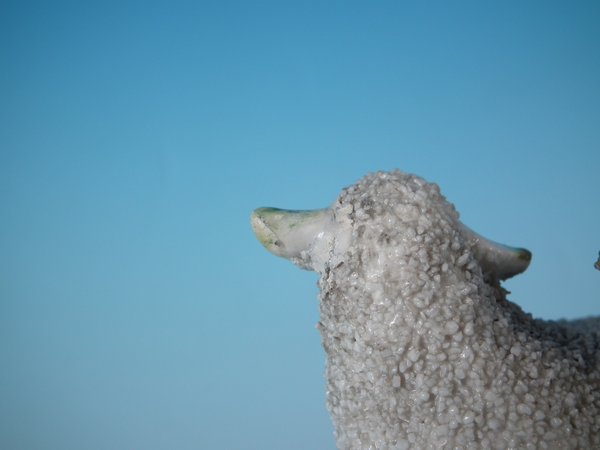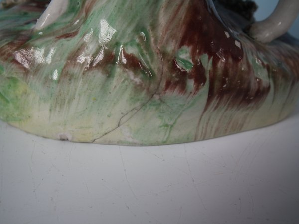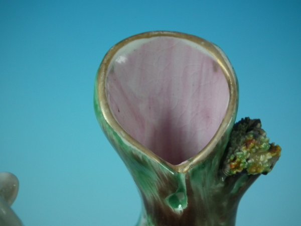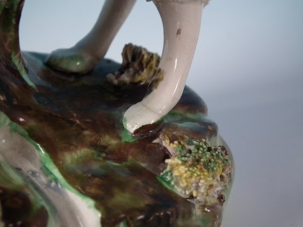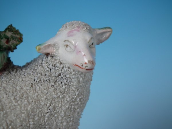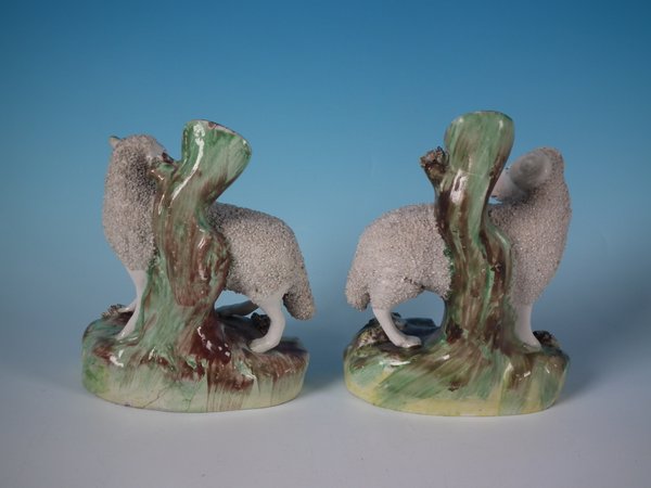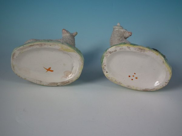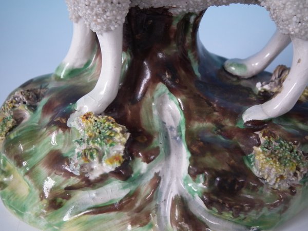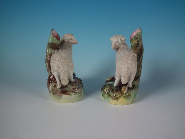 Victorian, circa 1870. Tallest is 5.3ins high, 4.3ins wide, 3.1ins depth. Pair of Parr Factory Staffordshire Pottery spill vases with a pastoral theme which feature a ram and a ewe, stood on a circular base.