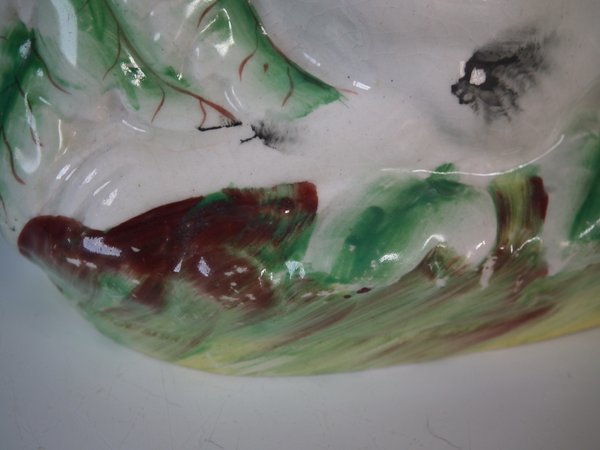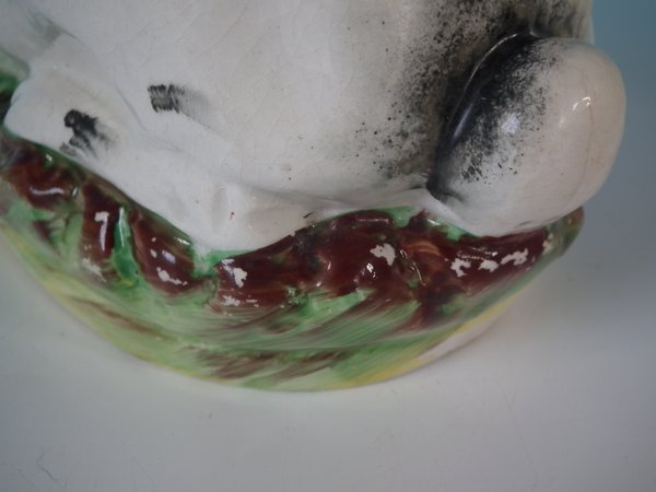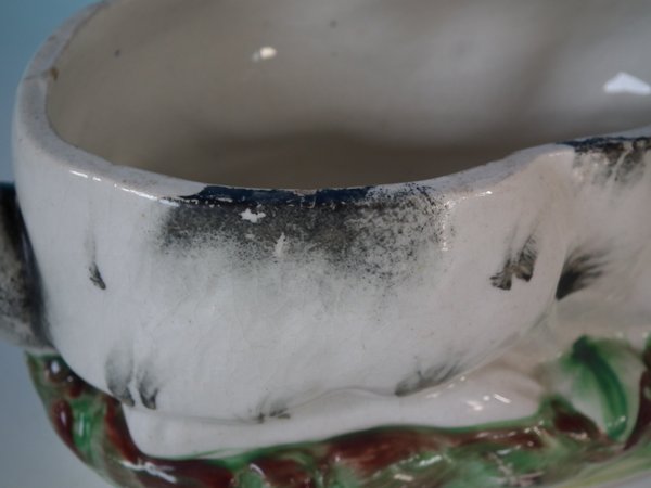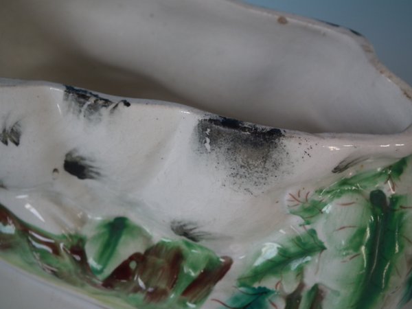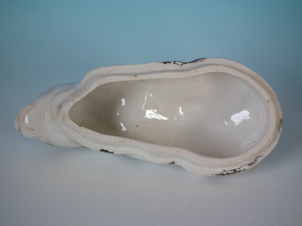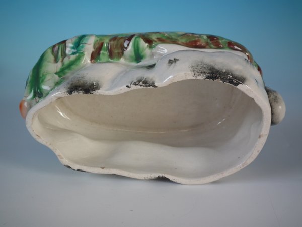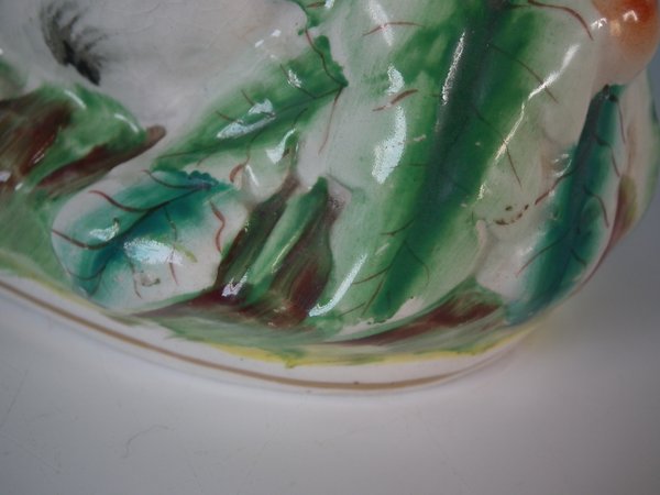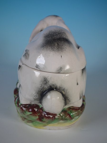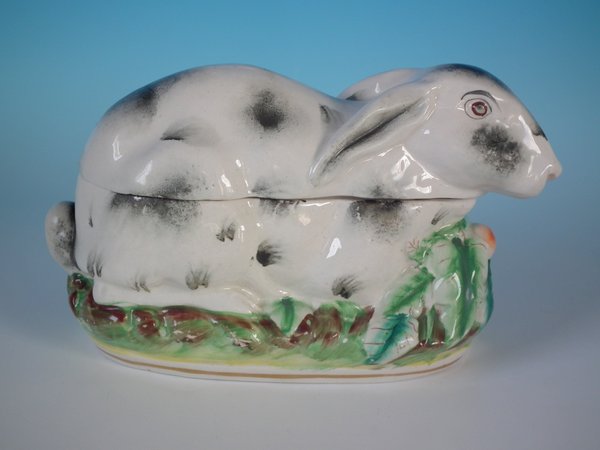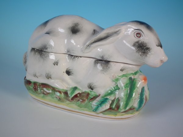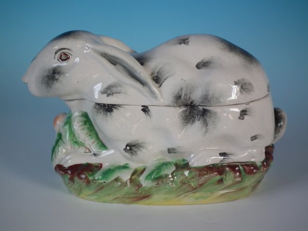 Victorian, circa 1870. 5.5ins high, 9.4ins wide, 4.3ins depth. Staffordshire Pottery tureen with cover which features a rabbit,