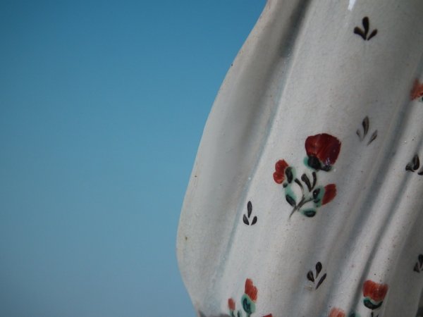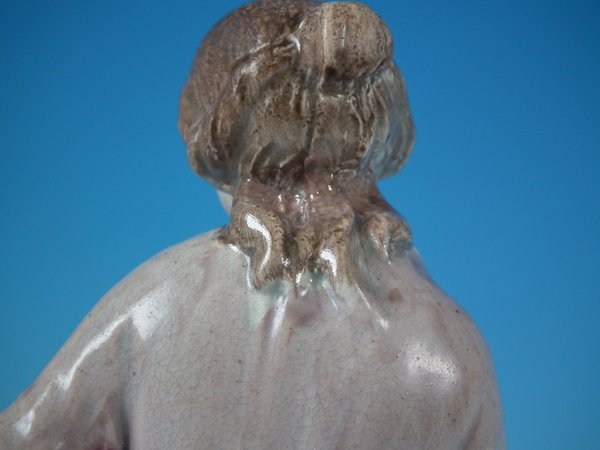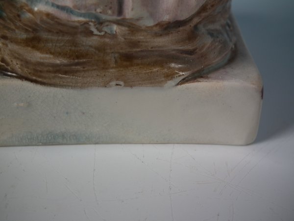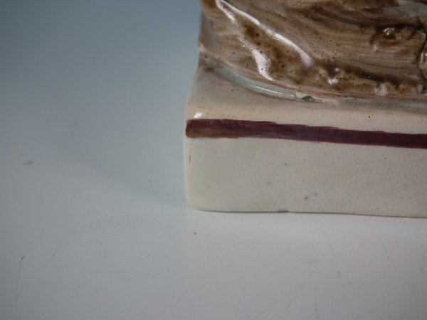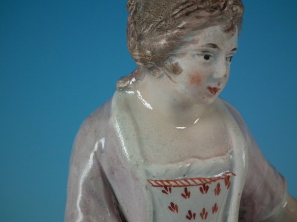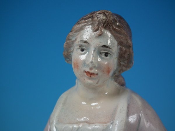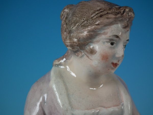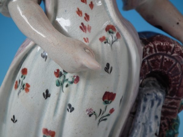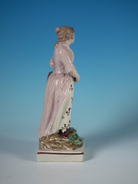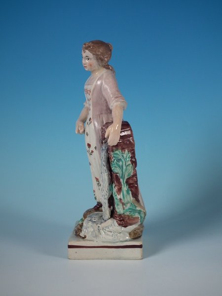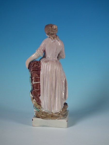 pre-Victorian, circa 1820. 7.9ins high, 3.1ins wide, 2.8ins depth. Ralph Wood Staffordshire Pottery pearlware figure which features a woman next to a water fountain, stood on a square base.