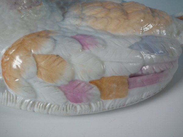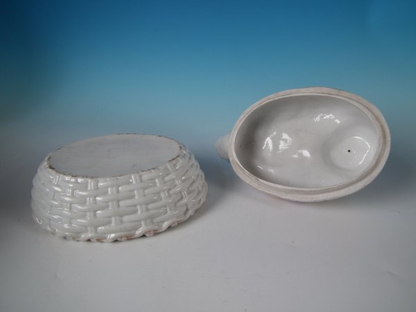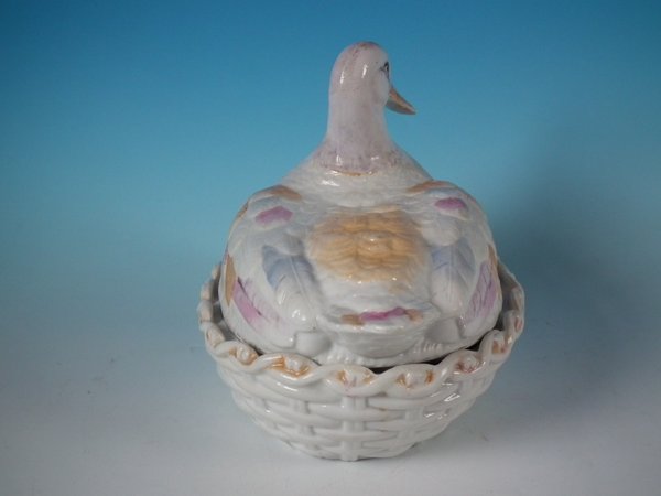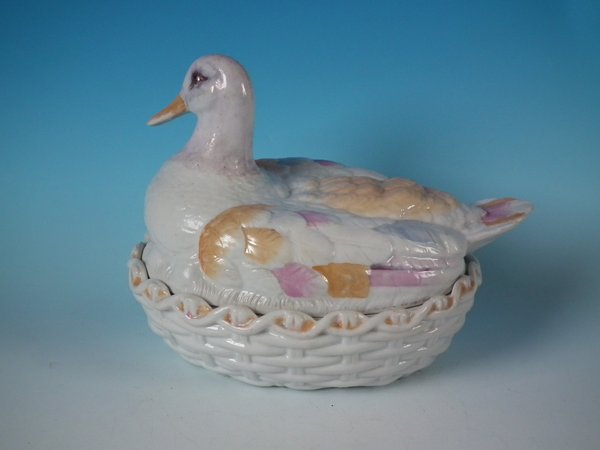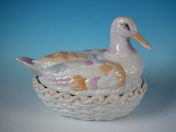 Victorian, circa 1880. 7.5ins high, 9.4ins wide, 7.1ins depth. Staffordshire Pottery tureen with cover which features a duck, seated on an oval basketweave tureen base.