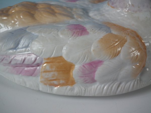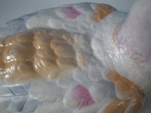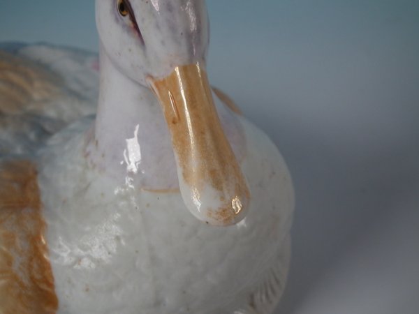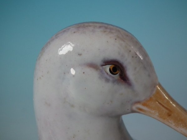 KILN EFFECTS: kiln soot caught in the glaze to the duck's head and back.