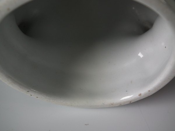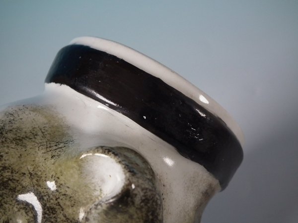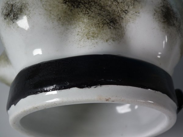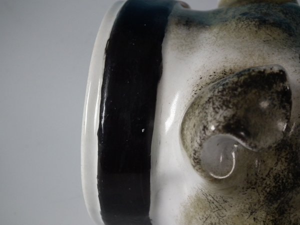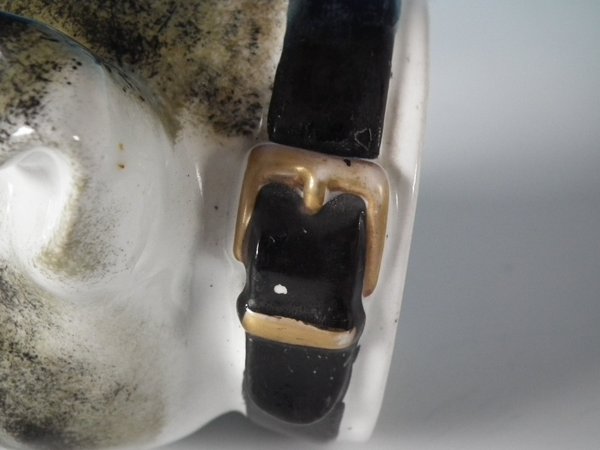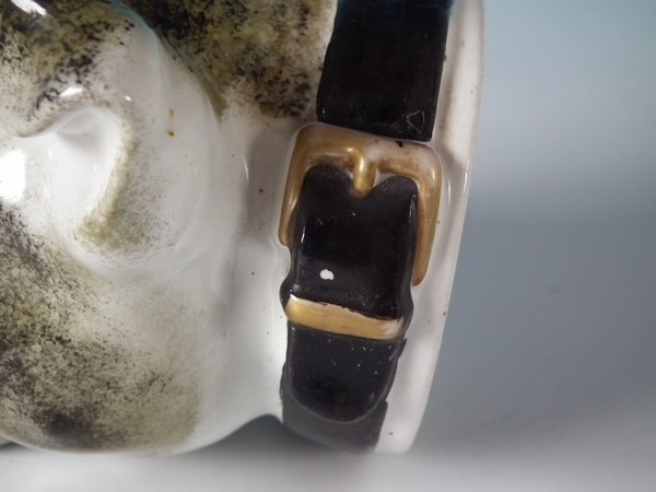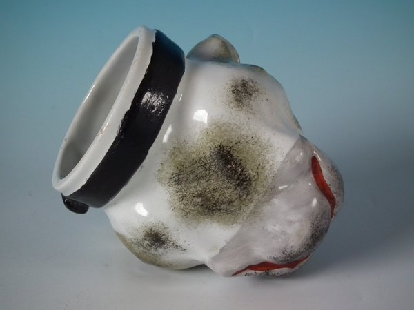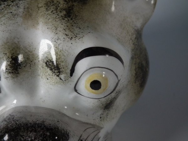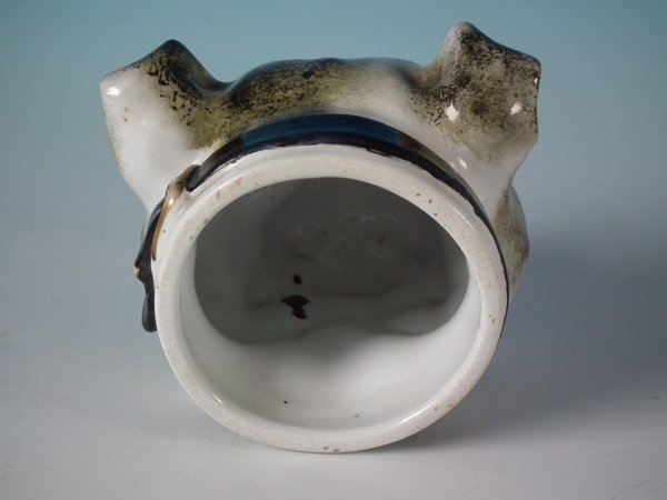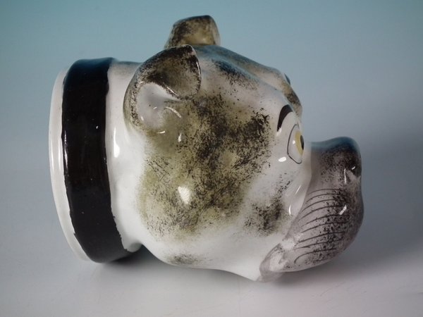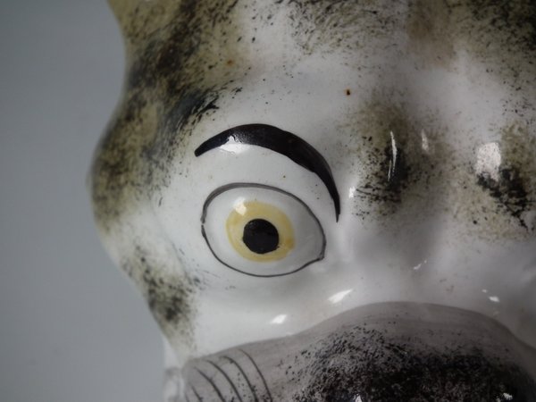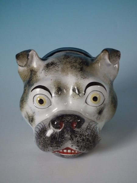 Victorian, circa 1860. 3.9ins high, 4.1ins wide, 4.7ins depth. Staffordshire Pottery stirrup cup which features a bulldog head, resting directly on the ground, no base.