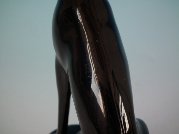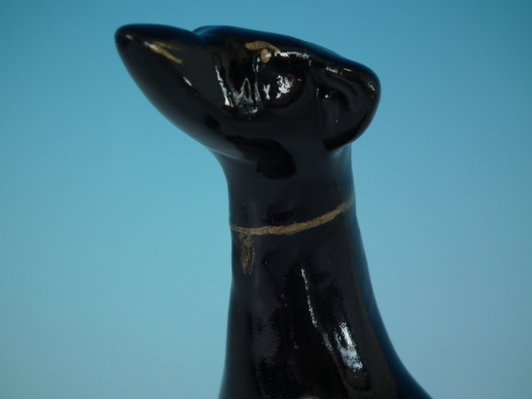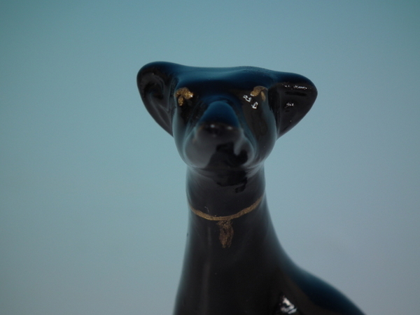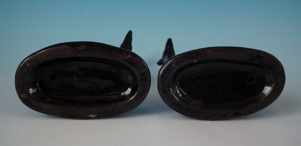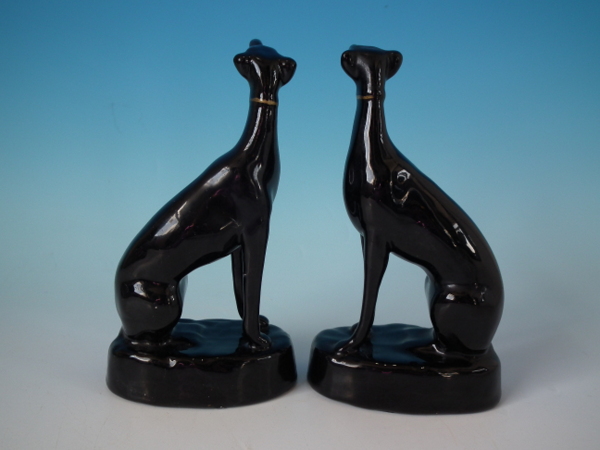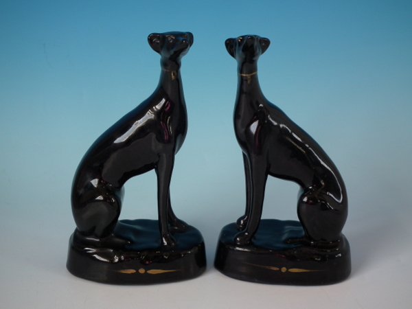 Pair of Staffordshire Pottery figures which feature whippets, seated on an oval base.