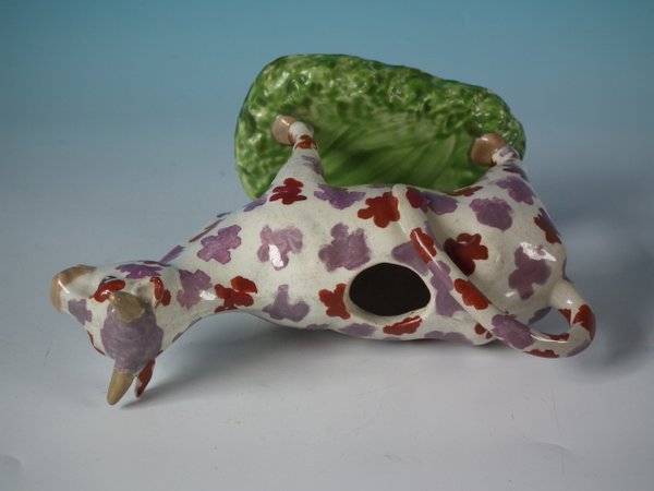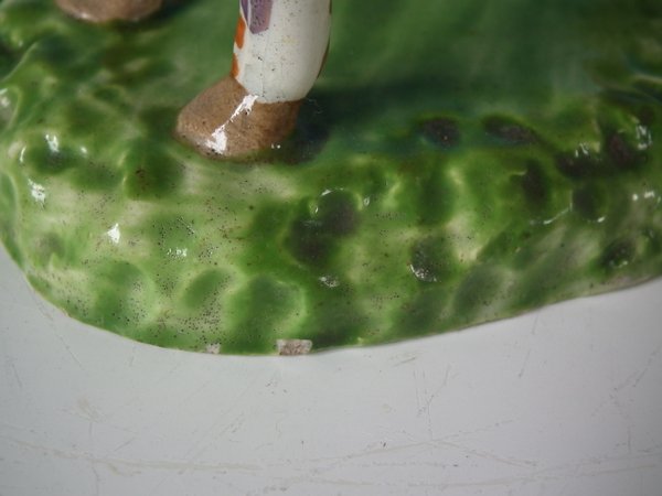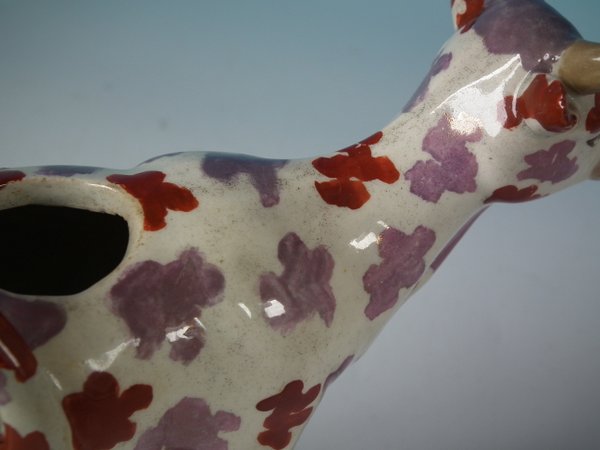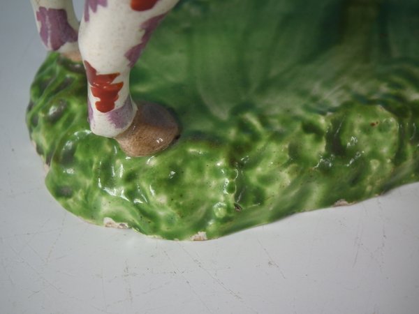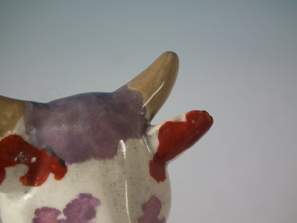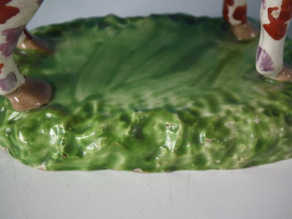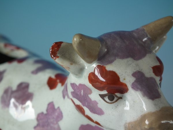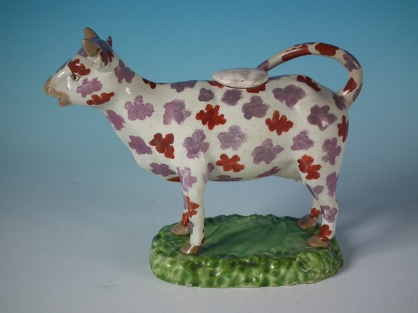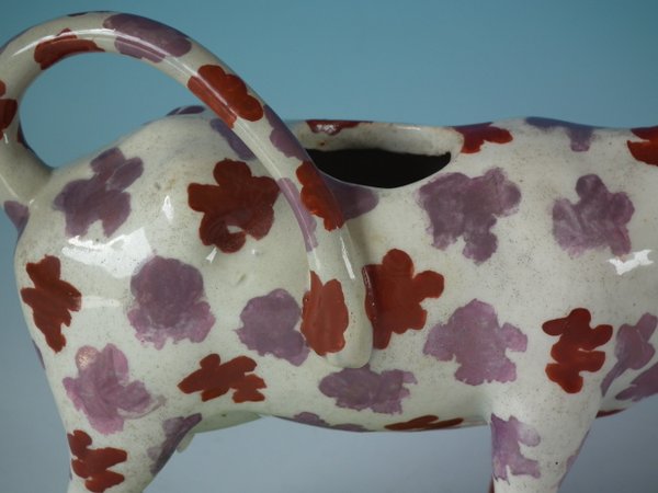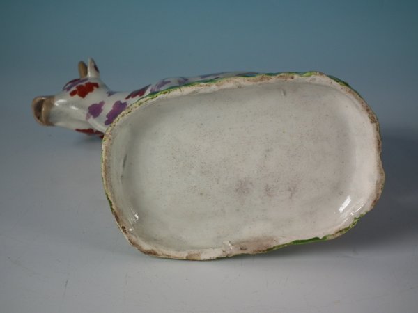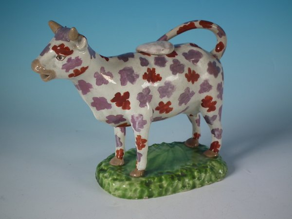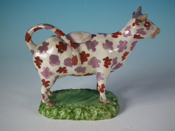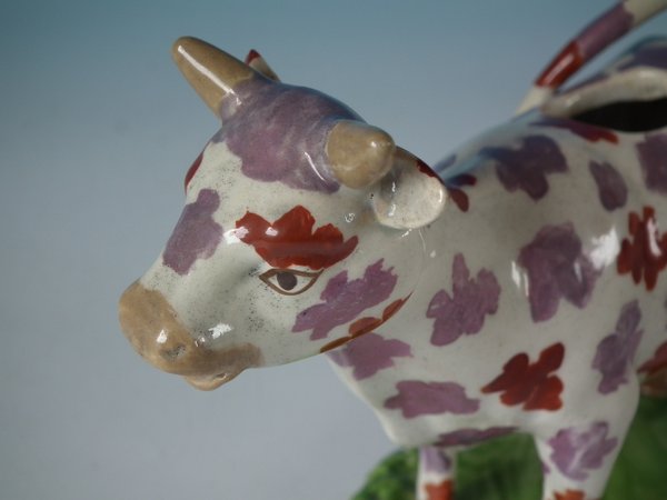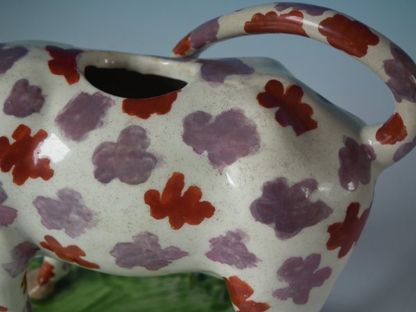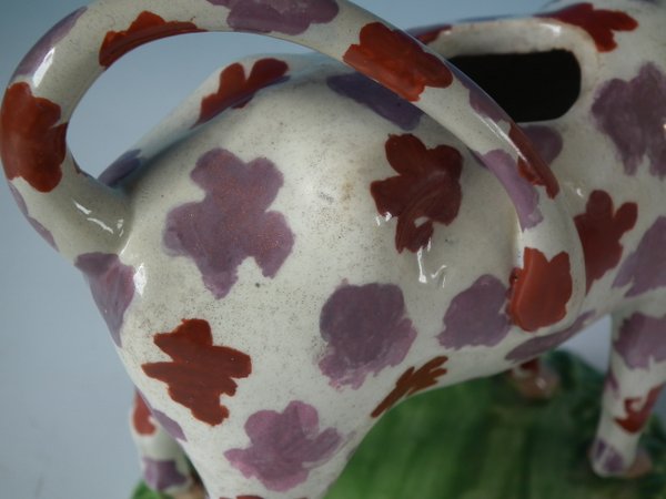pre-Victorian, circa 1830. 5.7ins high, 7.1ins wide, 3ins depth. Staffordshire Pottery pearlware cow creamer which features a cow, stood on a rectangular base.