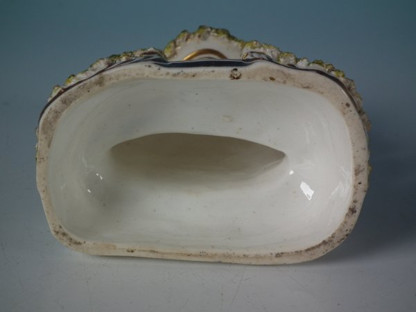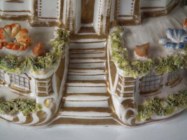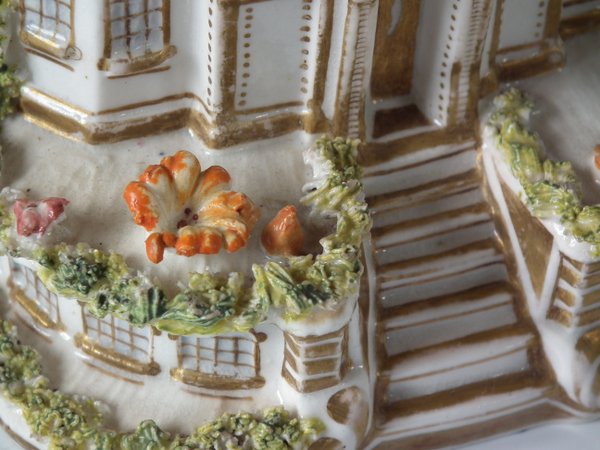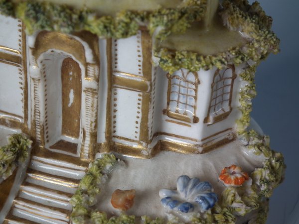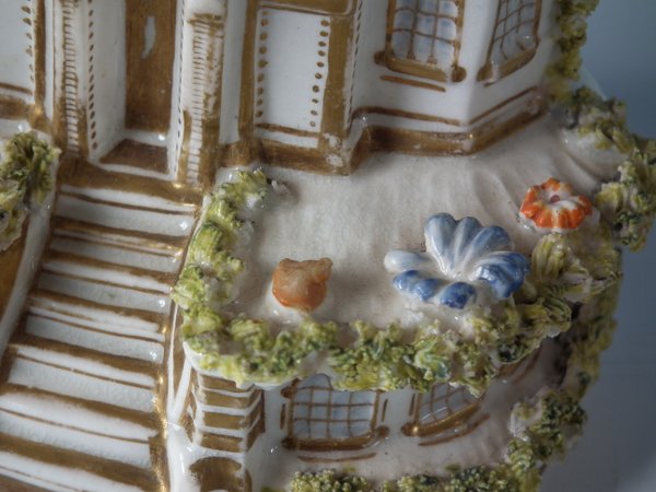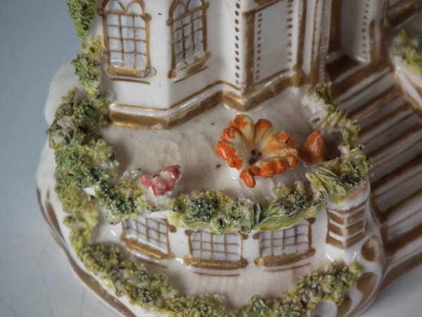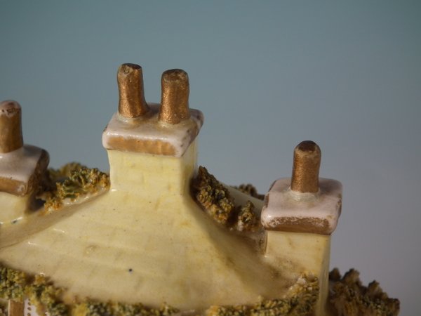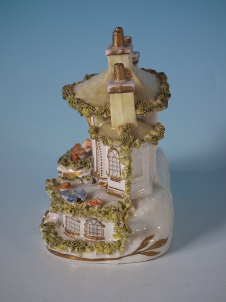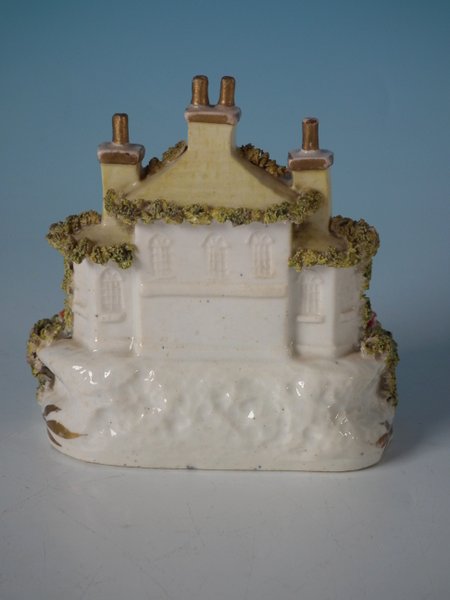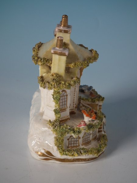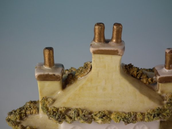Victorian, circa 1850. 3.7ins high, 3.6ins wide, 2.4ins depth. Staffordshire Pottery porcellaneous cottage which features unusually ornate gilding, stood on an oval hollow base.