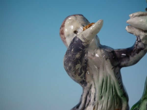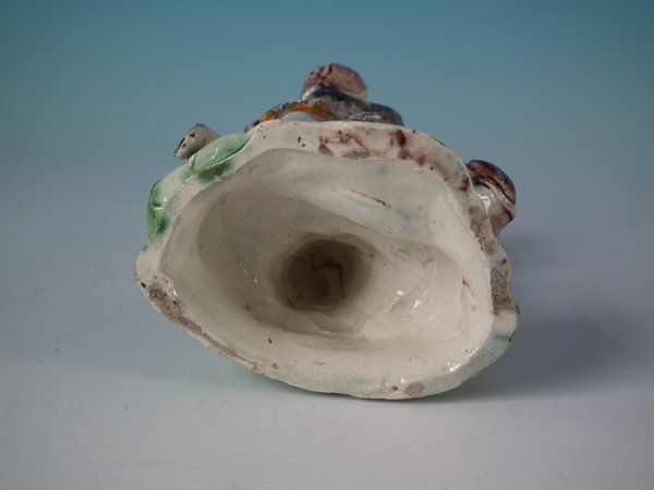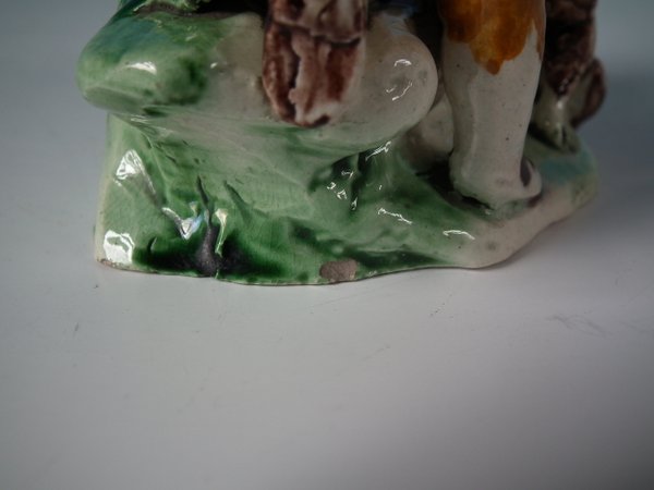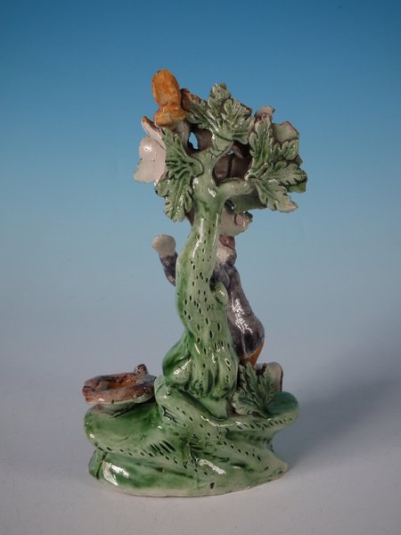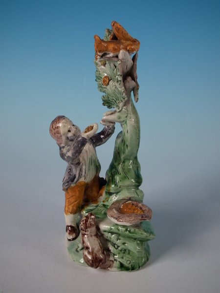 pre-Victorian, circa 1820. 6.3ins high, 3.5ins wide, 2.5ins depth. Tittensor-style Staffordshire Pottery Prattware bocage group with a pastoral theme which features a boy feeding a squirrel, stood on a shaped base.