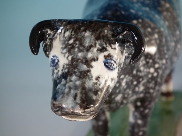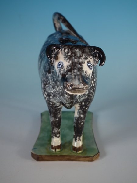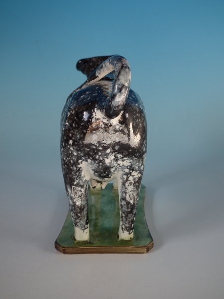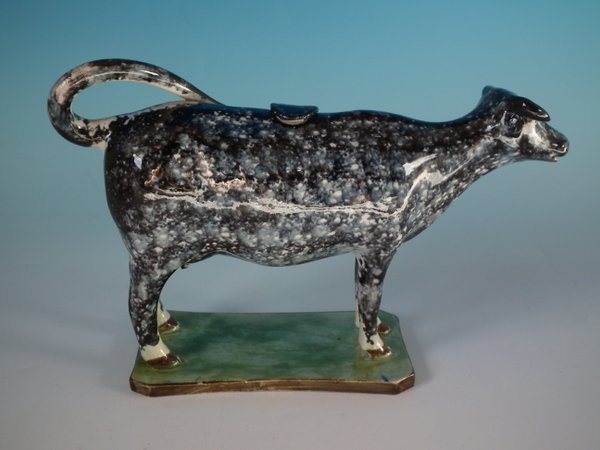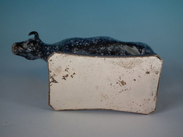 pre-Victorian, circa 1800. 5ins high, 7.7ins wide, 2.5ins depth. Staffordshire Pottery pearlware cow creamer which features a cow,
