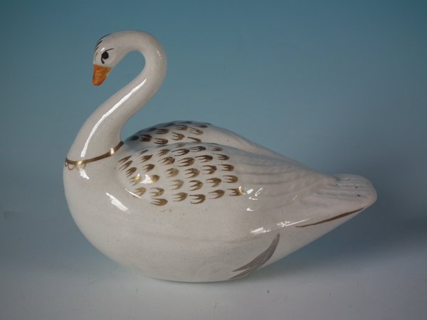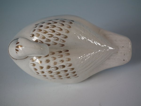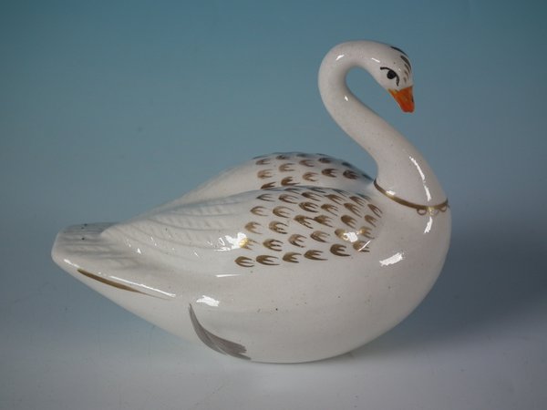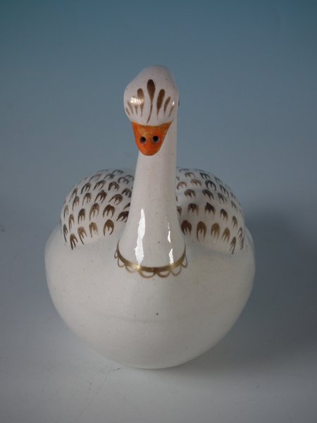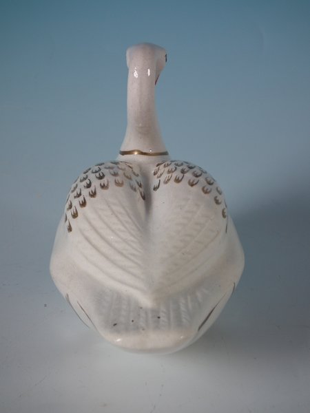 Victorian, circa 1860. 4.1ins high, 4.9ins wide, 3ins depth. Staffordshire Pottery floating ornament which features a swan - made for floating in a water feature or bath.
