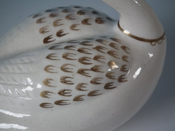 KILN EFFECTS: a few specks of kiln detritus caught in the glaze to the tail feathers.