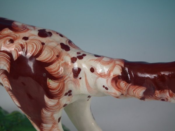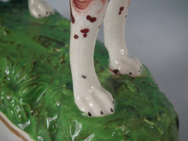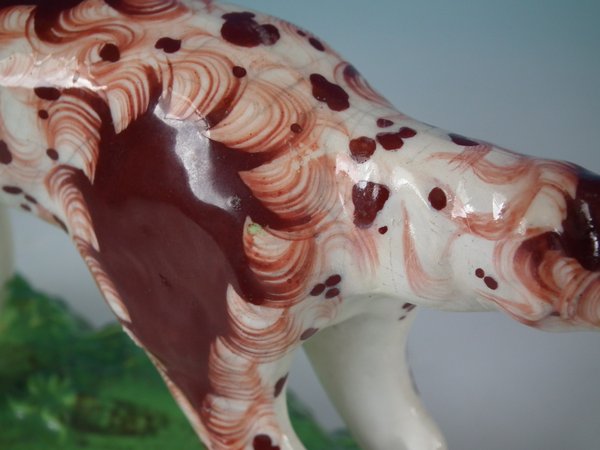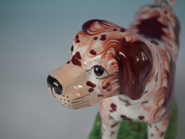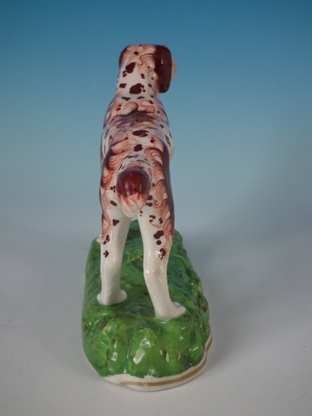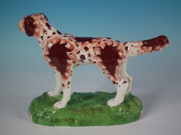Victorian, circa 1840. 6.5ins high, 8.5ins wide, 3.3ins depth. Staffordshire Pottery figure which features a Setter, stood on an oblong base.