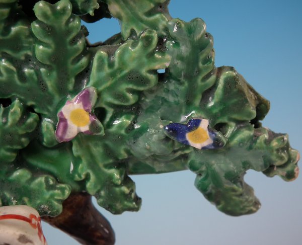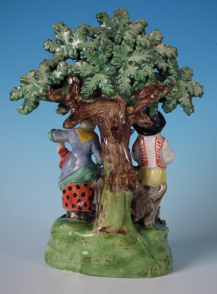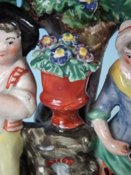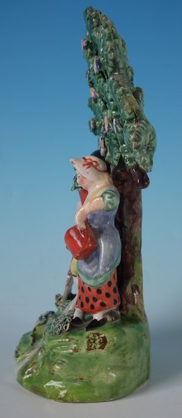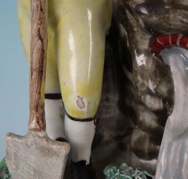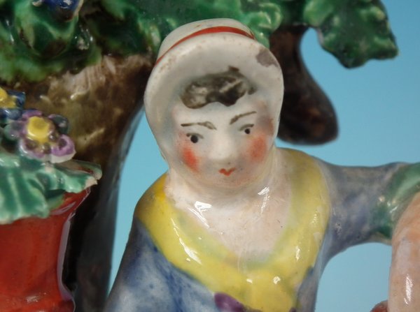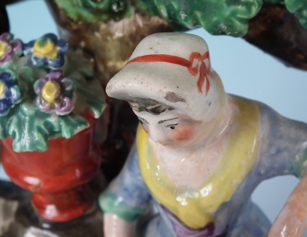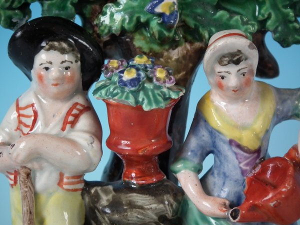 pre-Victorian, circa 1820. 7.9ins high, 5.8ins wide, 3ins depth. Staffordshire Pottery pearlware bocage group which features lady and gentleman gardeners, one holding a spade, the other a watering can, stood on an oval hollow base.