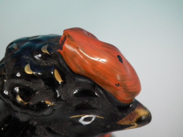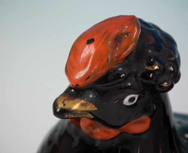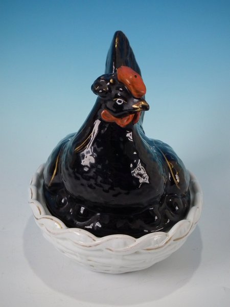 Hen: Good. No restoration. Some paint losses to the comb and white spots.