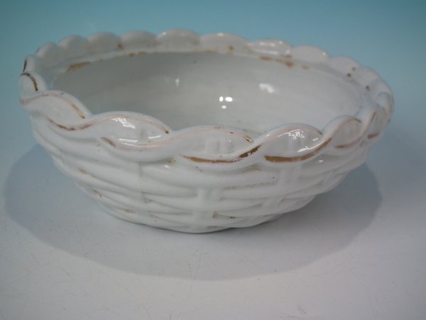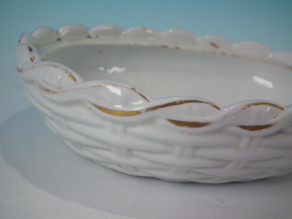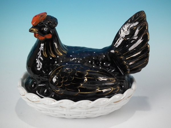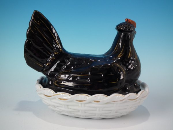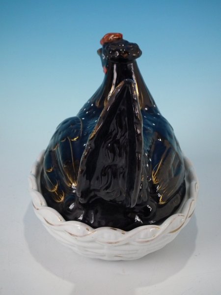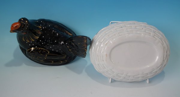 Staffordshire Pottery egg tureen and cover with a pastoral theme which features a hen on a basket, seated on a basketweave oval base.