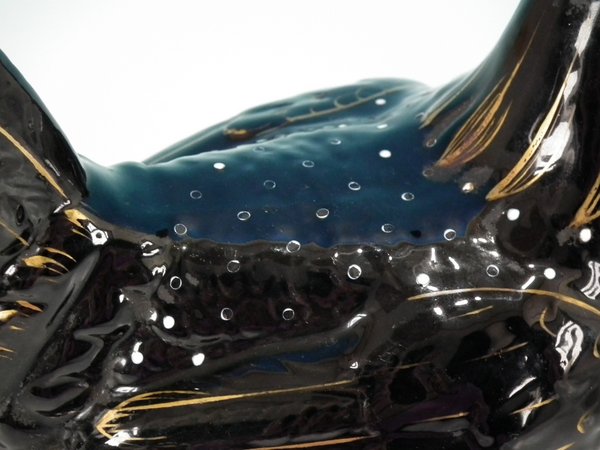 Jackfield black version. Dull gilt embellishment. Decorated 'in the round' - decoration to front and reverse.