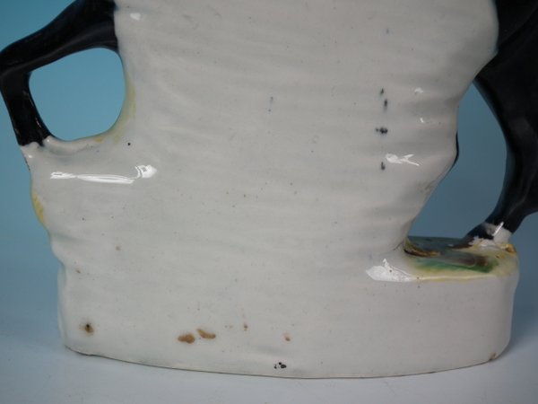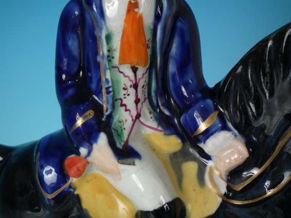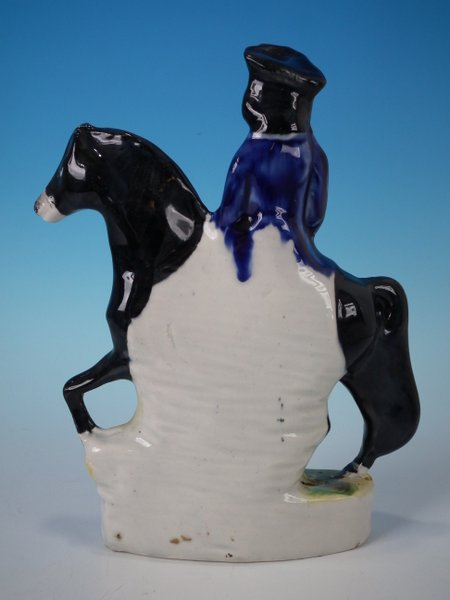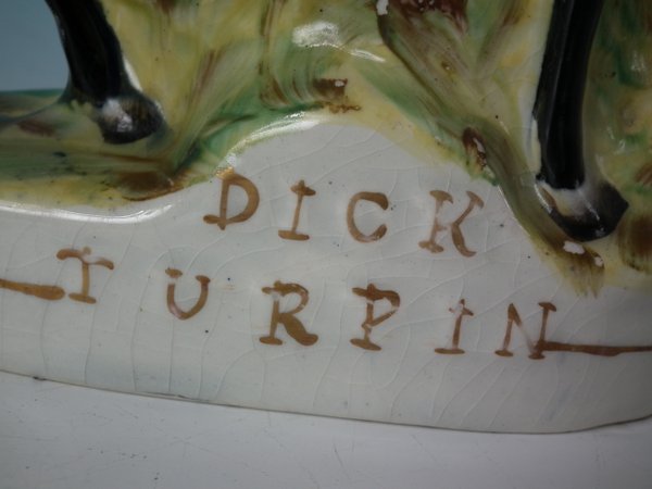 Staffordshire Pottery figure which features Dick Turpin on his mare Black Bess, stood on an oval base.