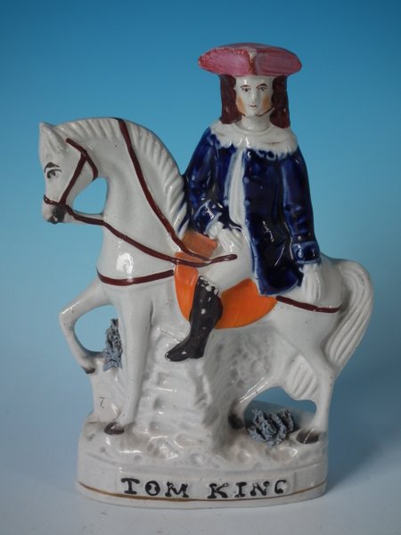 Victorian, circa 1860. 8.1ins high, 5.5ins wide, 2ins depth. Staffordshire Pottery figure with a folklore theme which features Tom King on horseback, stood on an oblong base. Dull gilt base line.