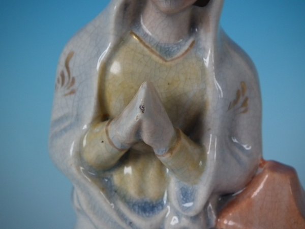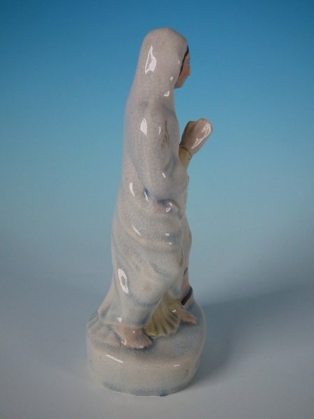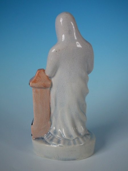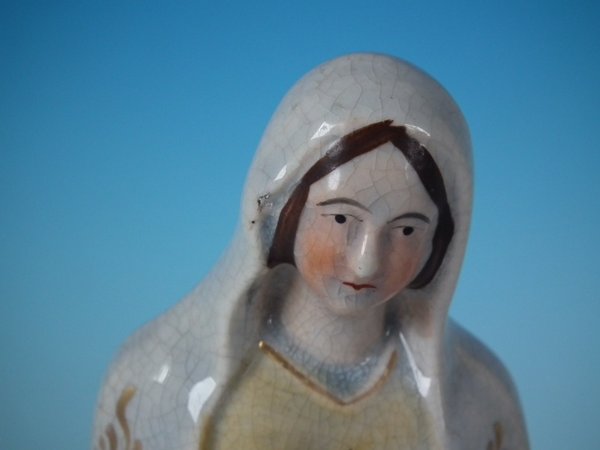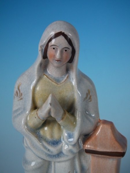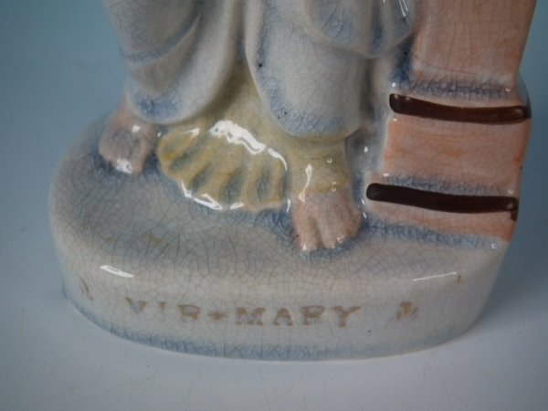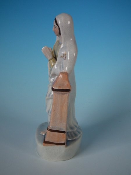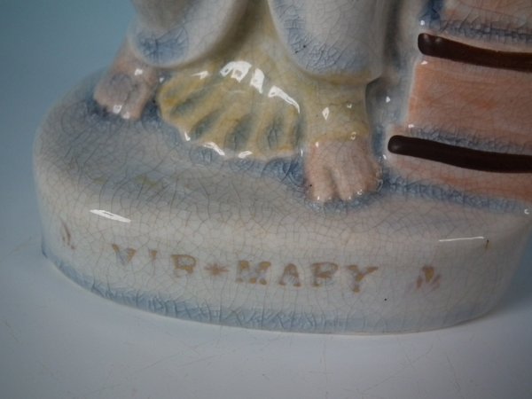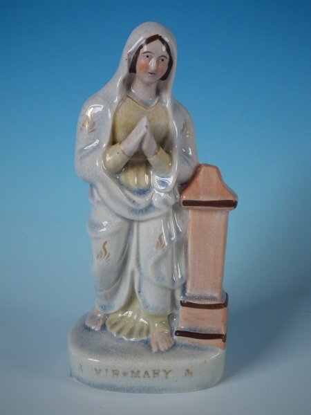 Staffordshire Pottery figure with a religious theme which features the Virgin Mary, stood on an oval base.