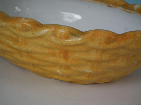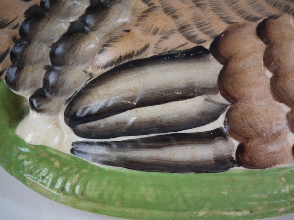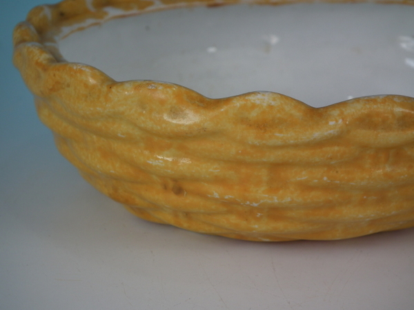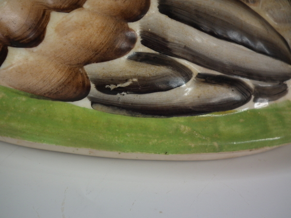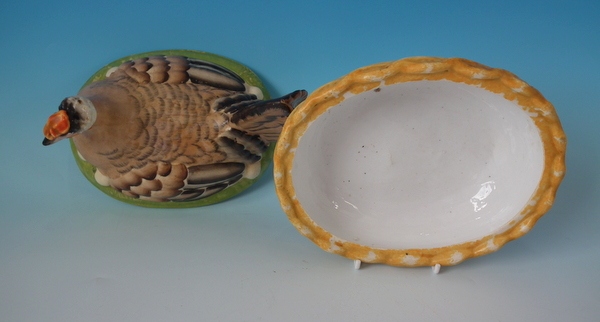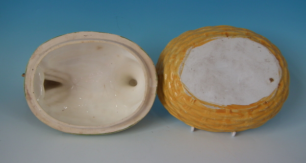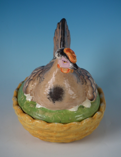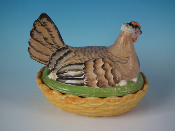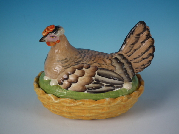 Staffordshire Pottery egg tureen and cover which features a hen, resting on a basketweave oval base.