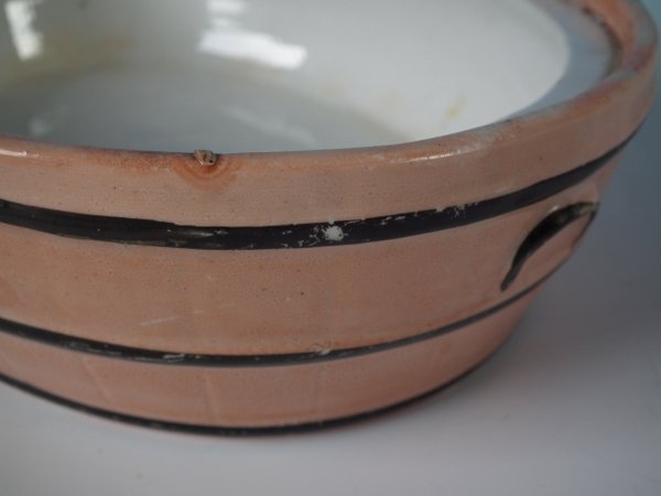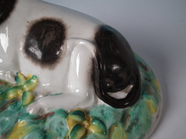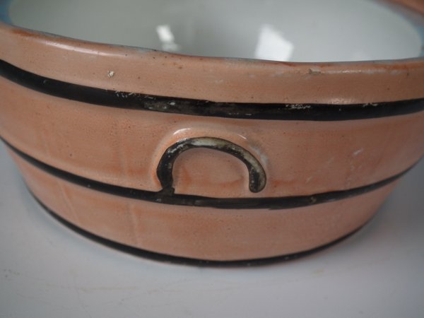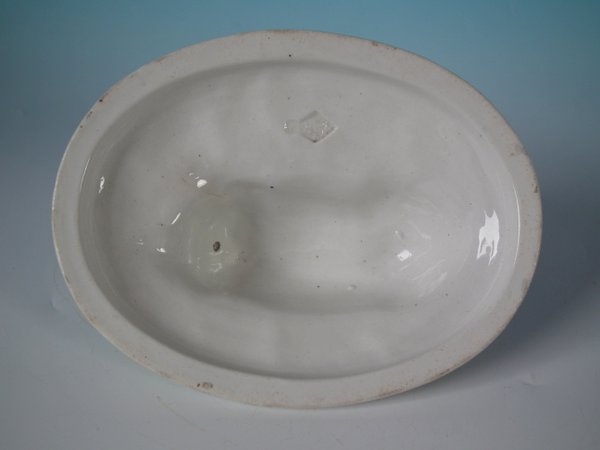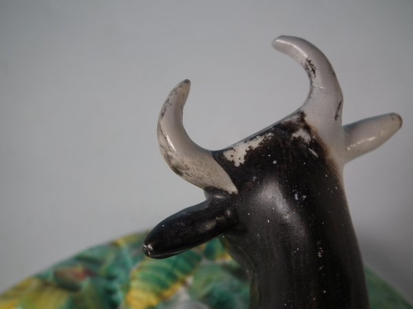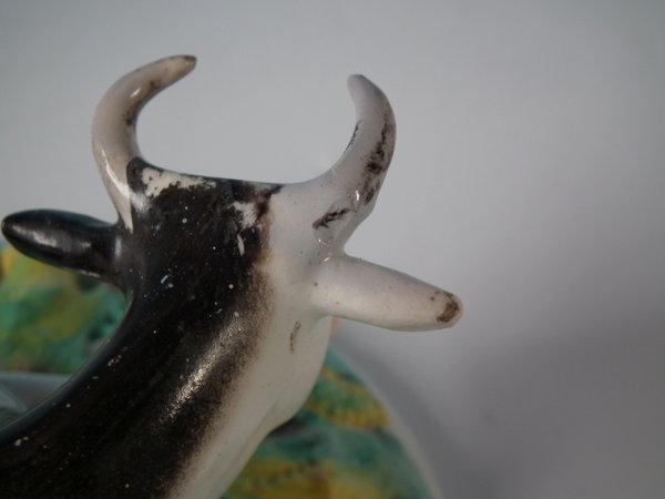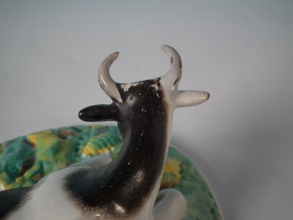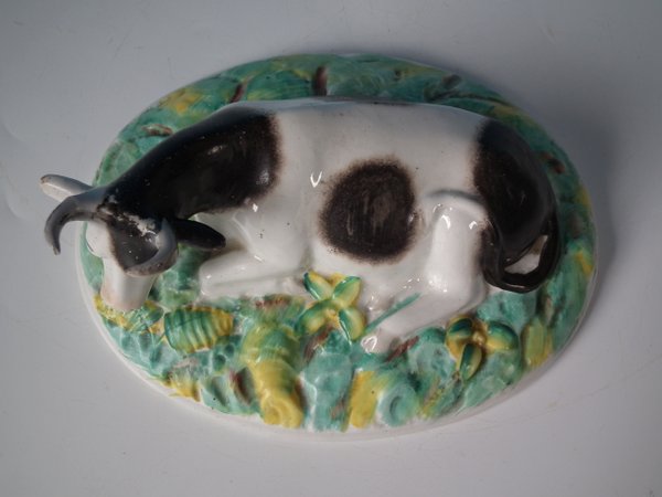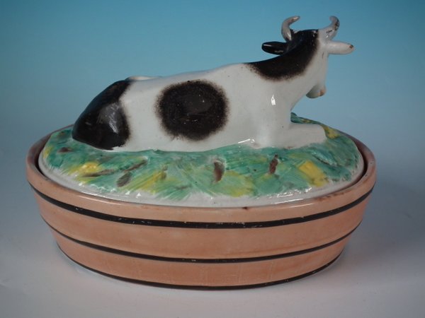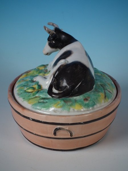 Victorian, circa 1870. 5.3ins high, 8.1ins wide, 6.3ins depth. Staffordshire Pottery butter dish with a pastoral theme which features a cow